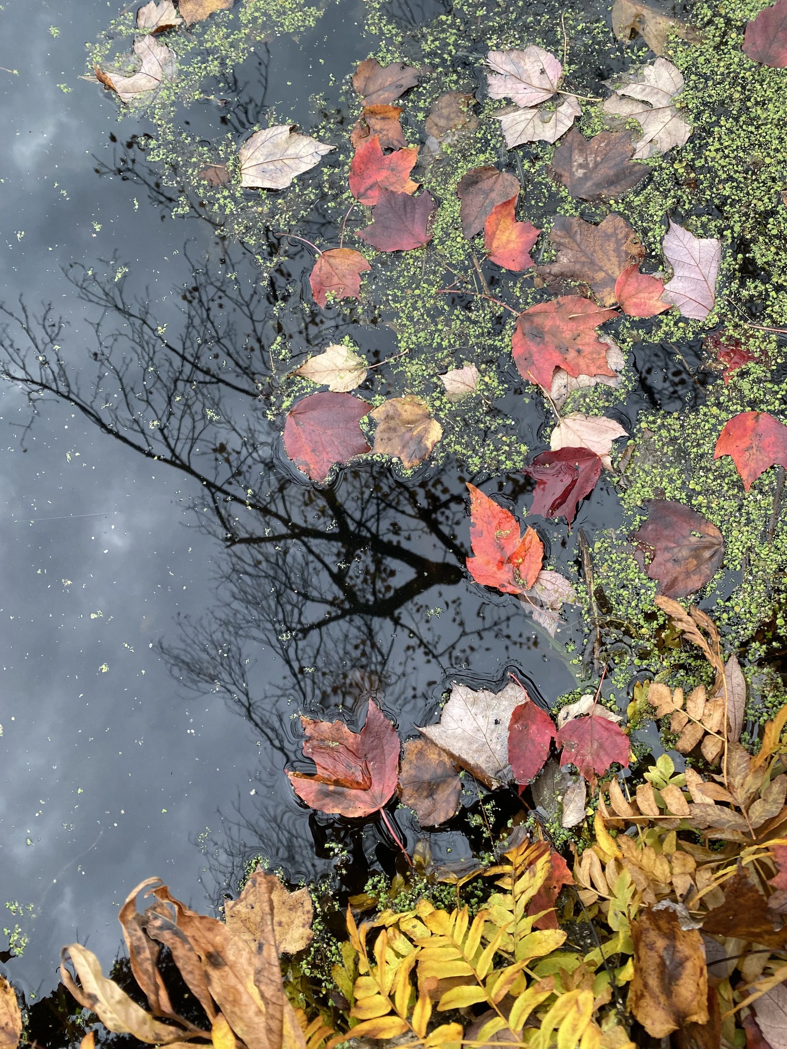 Such a pounding dripping slamming rain tonight outside the window in the dark while I was a poetry workshop. Grateful to have been back for my morning walk, as this kind of downpour will surely strip much of the wonderful foliage from the branches. It was a fabulous walk. Ran part of it, felt terrific, despite limited sleep. Asleep around 2:00 a.m. after returning home; awake by 6:00 to find my way down the hall to see a special one, who was awake Happiness And the kitchen was left clean for our return! I walked, trying to think if I was going to get a poem for tonight’s workshop. Nothing came into my head. Because to write you have to sit down and write. Which I did once I showered, outdoors still in the atmosphere of colorful. I surprised myself. A few notes, taken on the plane toward a poem that didn’t seem to be working. Then, finding my way in, this morning. And workshop feedback was very positive. The house is in the midst of much disruption from painting all of the upstairs except our room, which is done. A house full of workers by 7:00. Progress is being made. Mist rolled up the yard at dusk. The brook is full. And filling fast. And home.