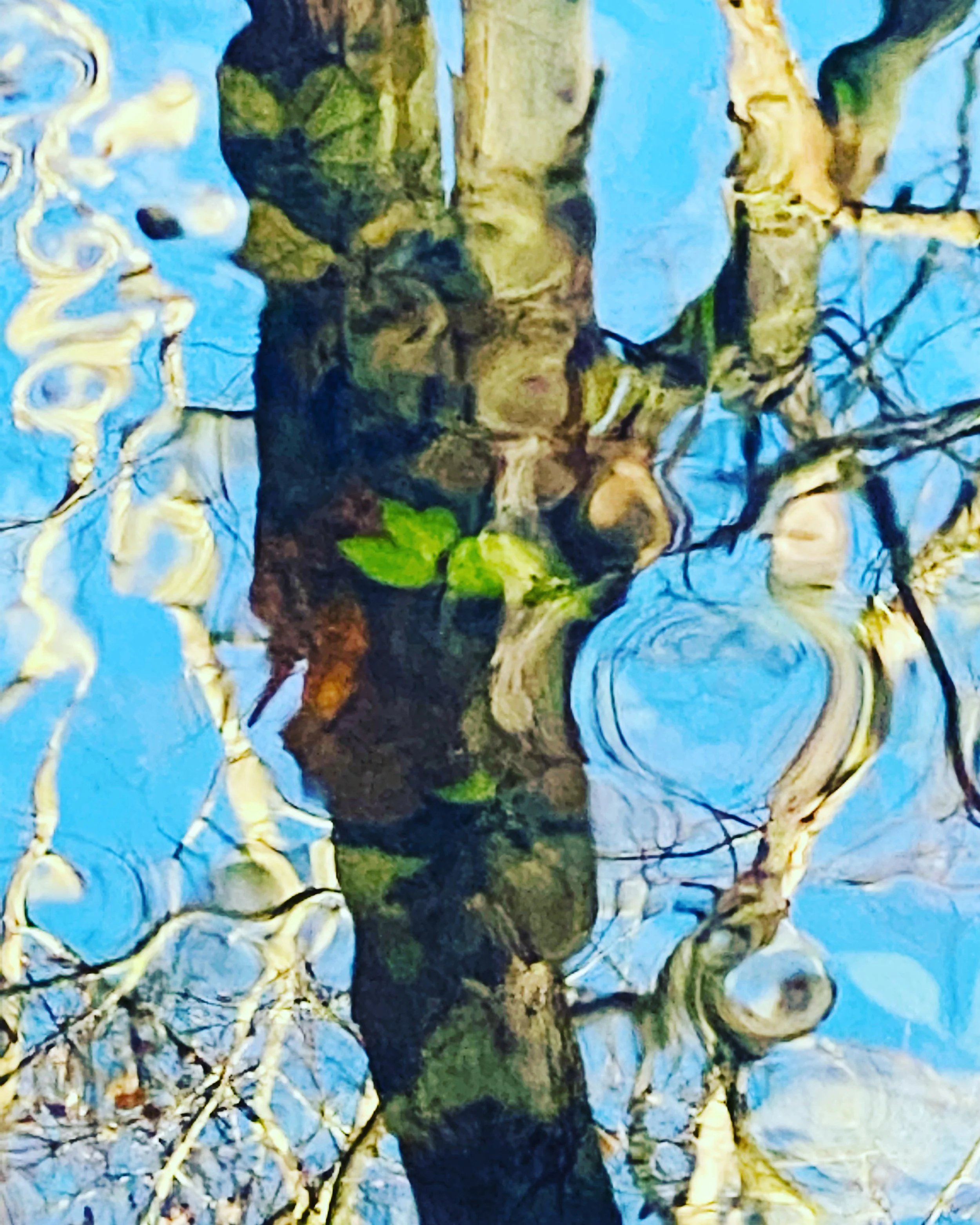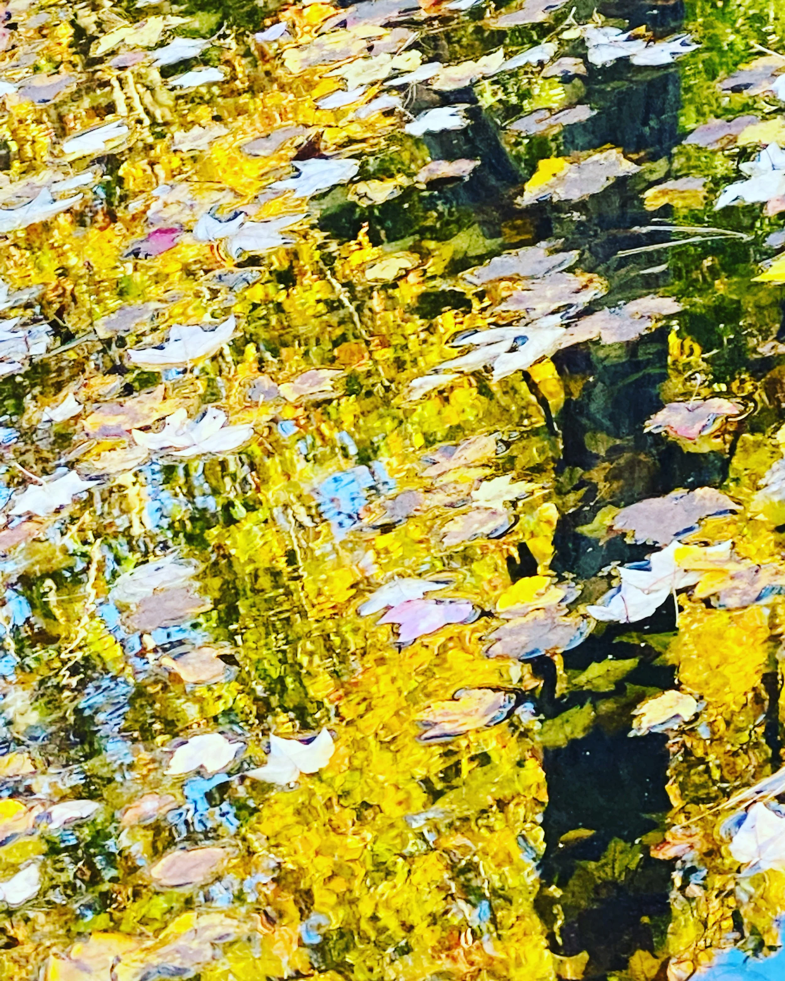 Every walk in this October foliage is splendor of color and sound. Feet shooshing through color on the ground, piles and layers of leaves. And all the reflections of the branches on the surfaces and in the ripples. Charlie seems not to be feeling chipper and will go to the vet Saturday. After my long walk I take a shower in the outdoor shower because I like being outdoors still and the leaves on the trees make music while I stand under the water listening. And because there are men in my bathroom, men in my closet, men on my stairs and in my halls and I cannot find privacy indoors. Everything is coming along, but truly, I had to slip into my daughter’s office, which is my guest room, most recently my bedroom, and get dressed while she was at the table working. Despite all this I had a productive day with clients and with my poetry friend who met on Zoom with me to share poems. I made meatballs for the Special One and played outside in the garden with him as he got dark and cold and finally, finally, he was ready to go indoors with me for his dinner. I had such a happy dream this morning I woke smiling. Now, the interesting thing was that in the dream I decided I was no longer afraid of snakes. Not even of being bitten by one. And I was bitten by a snake, three times in the dream, and the snake wasn’t poisonous and the bite was painful but tolerable. Not afraid of snakes! How wonderful to be in my dream and be bitten and not bothered.