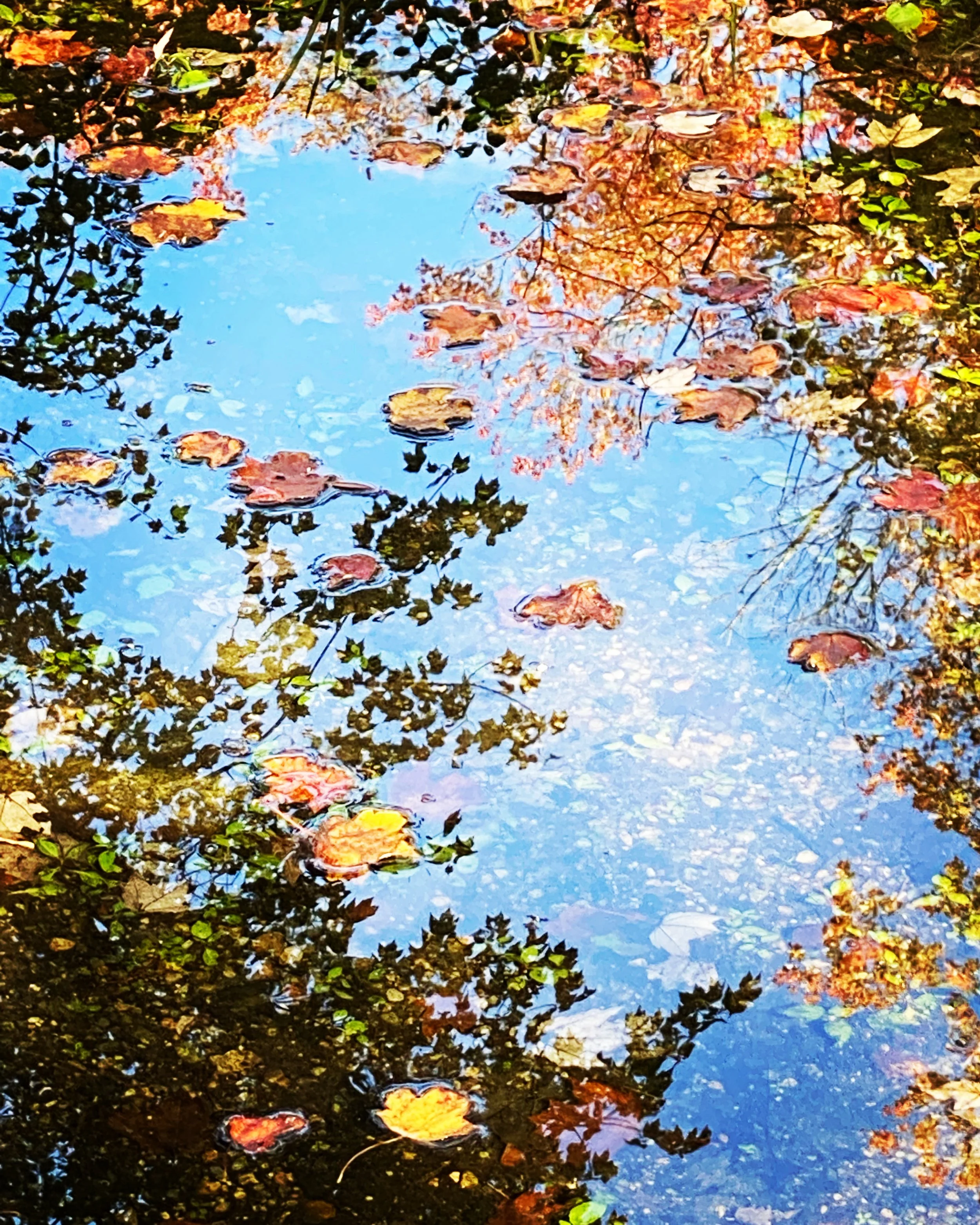 The experience of autumn at its peak of splendor is approaching. The moon tonight, almost full, rising in a cloudless blue sky as we sat on the deck over dinner in the balmy early evening. Morning walk into the woods, past the brook, full of rainwater and leaf litter. A walk with my dear friend, here for the weekend and talking over all the many activities and feelings and experiences and challenges filling our lives in the absence of seeing each other. Tonight, the windows open and the gladness of sleeping in the cross breeze of cool autumn air floating between the windows. How I love a cross breeze, and the one this room, in particular, offers. And in the afternoon, visiting another dear friend’s lush and whimsical and dynamic and surprising garden. Soaking in the presence of all her fascinating plants. A sensory delight, filling the spirit. After dinner, for one last look at the splendid moon, I walked across the lawn and field with a special one in my arms, my feet getting soaked in the dewey grass, to the river’s edge, and the moonglow above our heads spilling across the slender river.