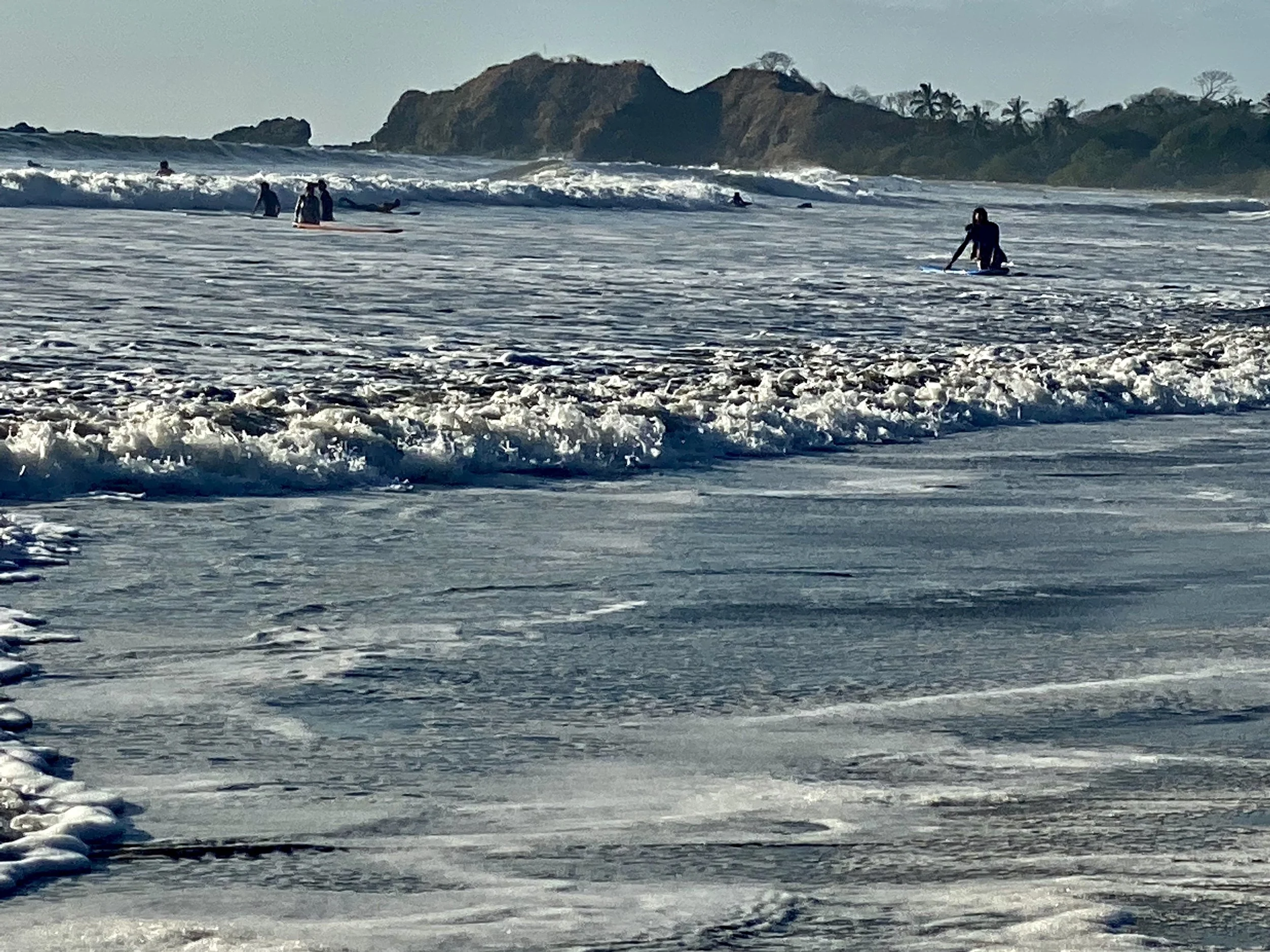 So little variation in the weather. Hot, dry, sunny. Maybe a cool breeze in the evening. I wake late, stomach bug, sleep in, skip my walk, doze a lot in the day, by the pool, in the sun, it’s not at all a bad way to feel unwell! In the afternoon, I get an acupuncture treatment from my friend, and then I feel revived. Sitting by the pool I revise my most recent poem––again. I think I’ve made progress. Of course, it’s a poem about New England. I have not written about Costa Rica. I don’t feel as if I know it very well yet. In the late afternoon I walk to the beach. Surfers everywhere, and families and couples and children crowd the happy, relaxed beach at high tide. I think, maybe I’ll walk. Maybe I’ll swim, but instead, I spread out my towel and nap until Frank arrives to watch the sunset by my side. It’s a quieter day; guests from our friend group have gone. Frank and I walk up the dusty dirt road toward our casa. Phone rings, the special one, facetime. I get a long connection where I get to recite nursery rhymes. Frank runs to the organic market two minutes away and then we have a relaxed and impromptu dinner with our friends. We plan a new beach hike for the early morning. When the weather, so predictable, will be all we need it to be.