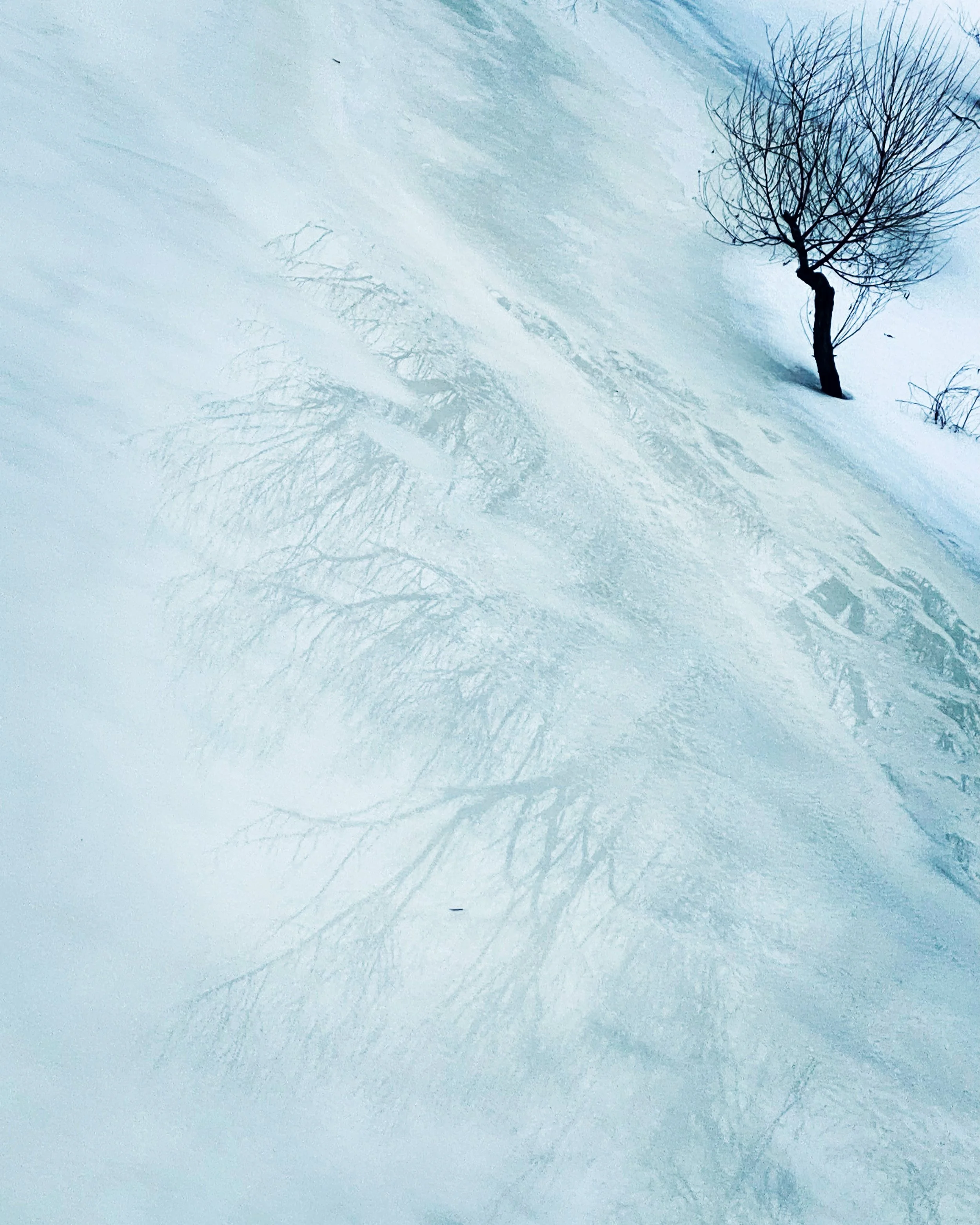 A chaos of helpers in the house by 8:00 a.m. and I have not yet had breakfast and there is clamor and activity and I escape as quickly as I can with the dogs out the door into the lovely, soothing, quiet, misted morning. It’s warmer, and the air is so moist, some rain coming. The snow is rained upon and melting. I don’t bother to put on my skis. I breathe into the shelter of the fog and thick air and release my stress. This disruption will last a while but not forever. The snow is an interesting canvas, and that’s what I pay attention to. And stop by the brook and go to the trestle bridge which is drawing me and look over the ice-melt surface in all shades of white and blue and charcoal and gray and it’s quite soothing, this sight. Today I have two afternoon appointments, but have the morning for errands. I am glad to be away from the house. I see my therapist on Zoom and get exactly what I need from this hour to feel attended to; I have clarity and refreshment, as I have the same from the river and woods. I feel misted and silvered and moistened by the attentiveness of Nina who has known me well and long. Therapy, a discipline like writing, the necessity of putting oneself in the chair to receive the goodies.
