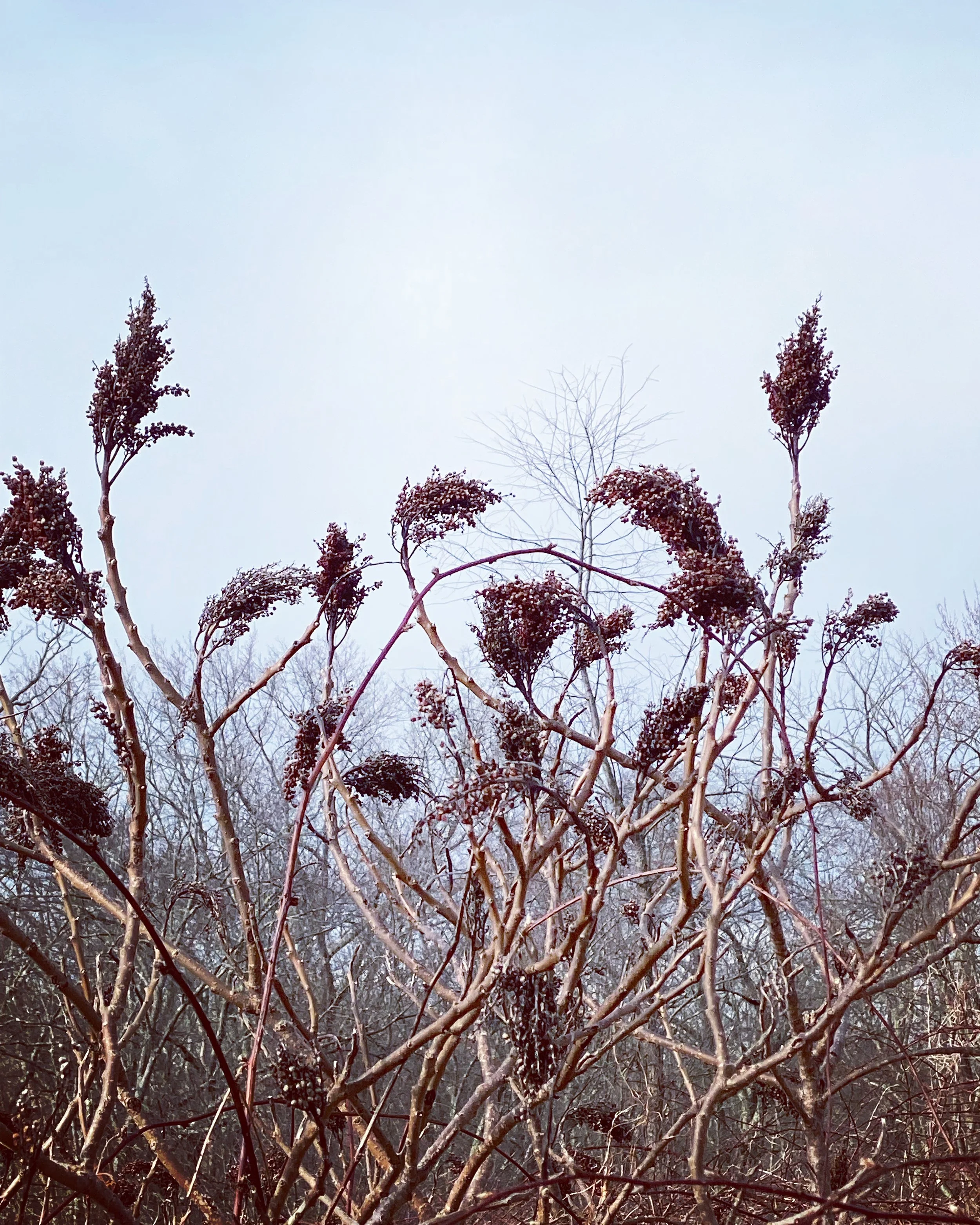 At one point this morning I looked up the lanes and down and realized I was the sole swimmer in the pool. Luxurious calm and peace. Suzi and Charlie were waiting in the car for me to do my laps. I took them on a walk on a Charles Link Trail that runs outside the fitness center in Medfield. Suzi was spry and happy, although it costs her, it does. We went through meadow, lingered in the marsh. Unleashed the two of them loved our adventure. I kept looking for signs of spring, but it has not yet really sprung. Last year’s sumac under a blue-gray sky. It was chilly, not freezing. I found a little purple spreading ground cover in bloom; I don’t know its name. Once home, I went on a Zoom with my friend who moved to California and another dear friend because we miss each other, and this was a brilliant way to connect deeply, as it turns out. To catch each other up. Then, out with Frank. Unplanned, we stopped and picked out a new dining room table for when the construction is done. We completely agreed on the one he had his eye on. He has a great vision for the rooms to come into being. Even running errands, we were happy to have this time together, catching up, and having those conversations we only have when riding around in a car. Tonight, both daughters here and daughter’s boyfriend and we set up folding tables in the deconstructed dining room to have our meal together. We tell them about the table of our dreams that we will sit at some day soon.