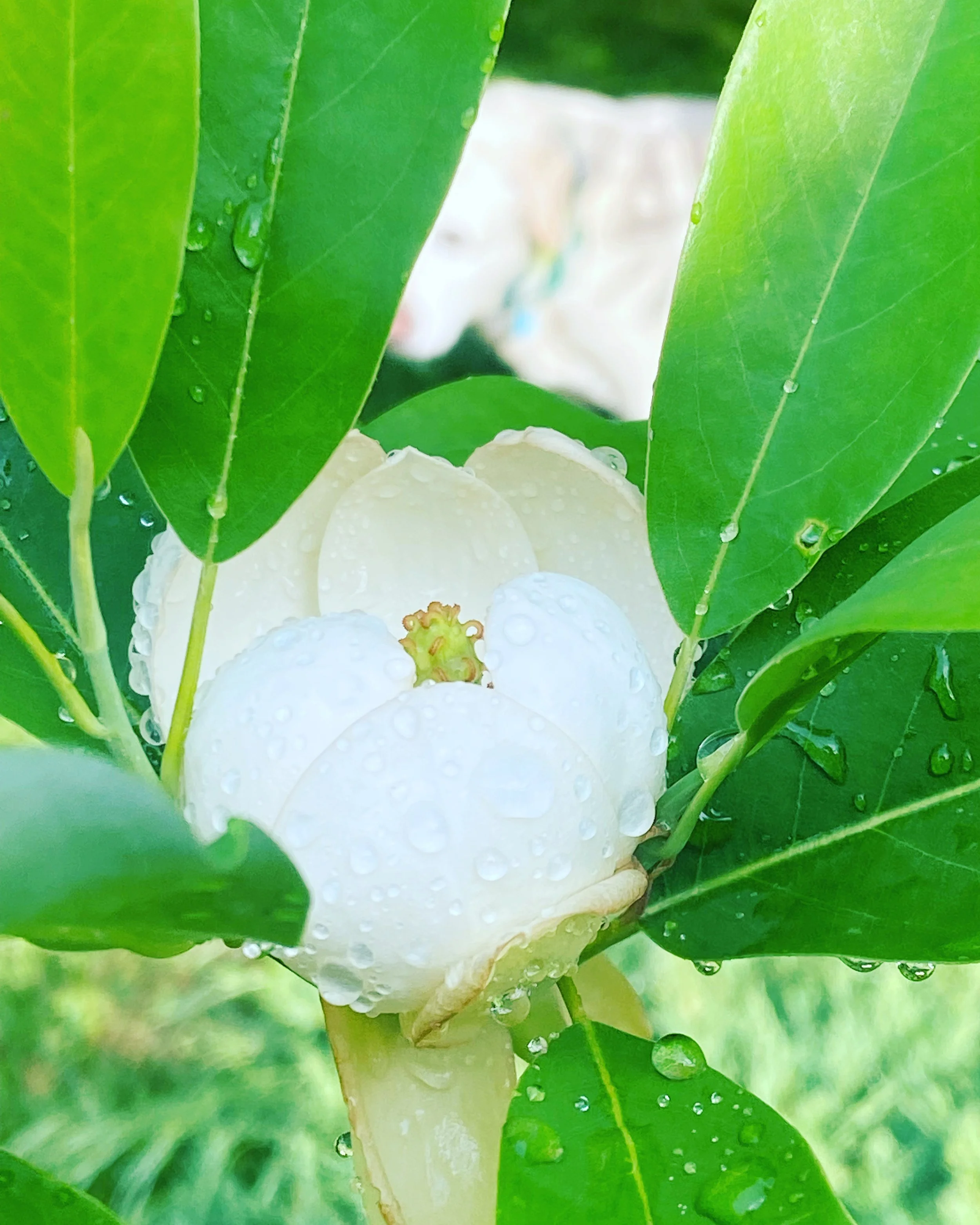 Oh, Monday. Monday in the house, waking up. A kind of tense grumble in the air. Household of tired bodies. One bunny in the bushes. No frogs visible in the pond. I am so pleased to see my magnolia shrubs in bloom with a bit of last night’s rain drops. I stop at the brook to be mindful. To appreciate all that is green and to feel a greening in spirit. Charlie and I walk into the morning being cheerful. Suzi comes part way. Much to accomplish at my desk—plans for the week with workshops. And a poem to write for tonight. I begin a new poem from letters––new set of letters––to act on the idea that came to me while meditating at the fountain in the Tuileries in Paris. A beginning. There are vegetables in the kitchen to be roasted for dinner. A swim in Farm Pond, sun on my back, late afternoon, hot afternoon, refreshment. My half-hour course from the boat ramp. My breath finds a rhythm and relaxes. I am here now.