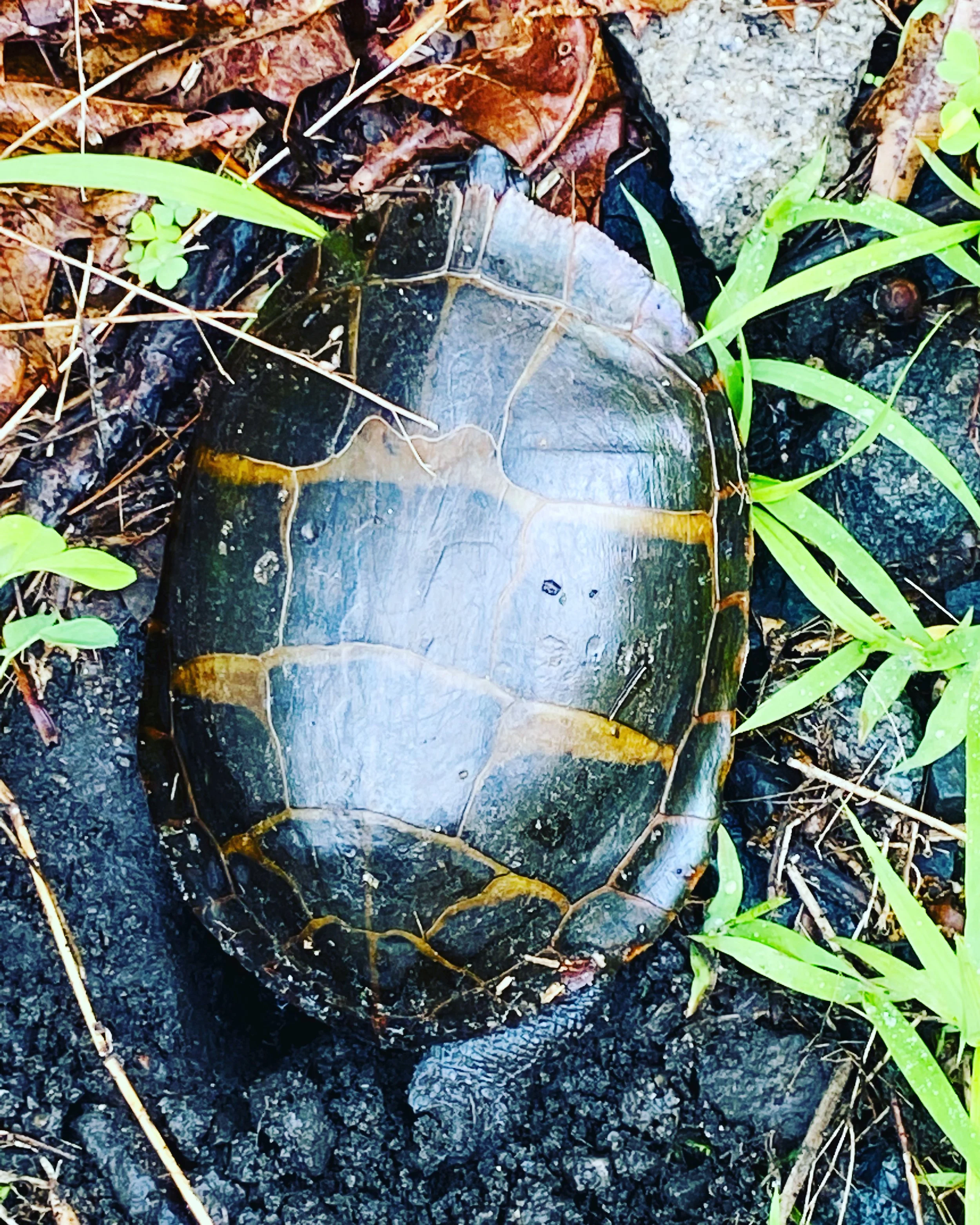 Wake up, still on Paris time. It’s around 4:00 a.m. Frank is up as well. It’s raining, and I’m glad. Everything getting a pollen rinse and a good wholesome watering. All the clutter of returning home to wade through. First, a walk, with my passenger. My most special passenger with me out into a light rain. And the sight of so much on the property blooming! All the roses, many azaleas, some rhododendrons, the laurel, some hydrangea, the milkweed, the magnolia––and the peonies drooping extravagantly to the wet ground. A heron on the river in flight. I am so, so happy to be home on the river. Along the railroad tracks we see two turtles laying eggs in the gravel. Crossing the river, spot the muskrat who lives near the trestle bridge. Charlie is so happy for this time with us, and crosses with us, no anxiety. The lily pads are gorgeous in the wetlands. The lawn is high, the weeds overtaking all the gardens. But I will get to it when I can. It will all get done. I have a day with the special one to focus on.