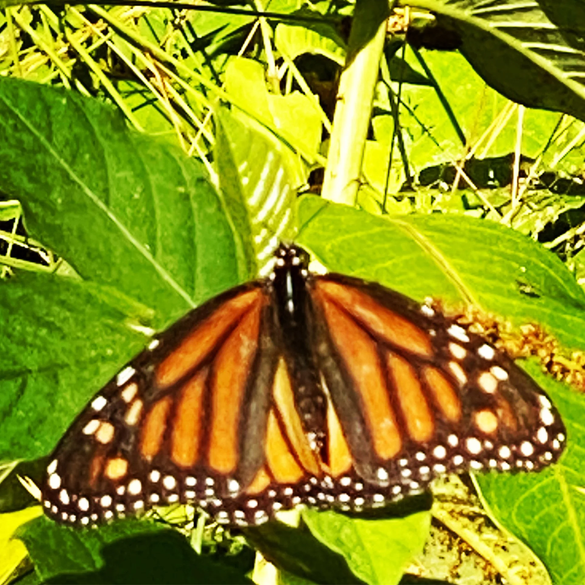 Fortunately, tonight, I check my e-mail just before blogging. It’s been on my mind all day, but I forgot anyway, to send a poem for a workshop I’m going to take while I’m teaching at the IWWG Annual Summer weeklong that starts a week from today. So, a quick decision, followed by a quick revision. Wrote this poem a few months ago, a spring poem, and workshopped it a couple of times. As soon as I sent it off, I looked one more time and could see all the flaws. Oh well, I will look forward to the feedback. (I like this poem a lot.) This morning I had a delicious long ramble in the sunny warm meadows and woods with Charleston and saw my first monarch of the season in the milkweed! I’ve been watching this meadow patch of milkweed for the past week, as I often see monarchs here. There she was! I had to wade around in the thick and high weeds quite a bit, following her, being quiet and patient, to get this pic. Today I felt a lightness of heart and also a tiredness. I let myself be tired. Tonight, after dinner, Frank and I sat outside in the summer evening. Just sat. I so rarely just sit. And relaxed, and chatted. Watched the planes in the sky. Sat for a long time before cleaning a few things up and going in. Today I also had a very nice e-mail from the journal that’s publishing four of my poems and an essay any day now. The editor saying he had only picked three poets to feature in this issue and how glad he was that I was one of them. The monarch in the milkweed, a very hopeful sign.