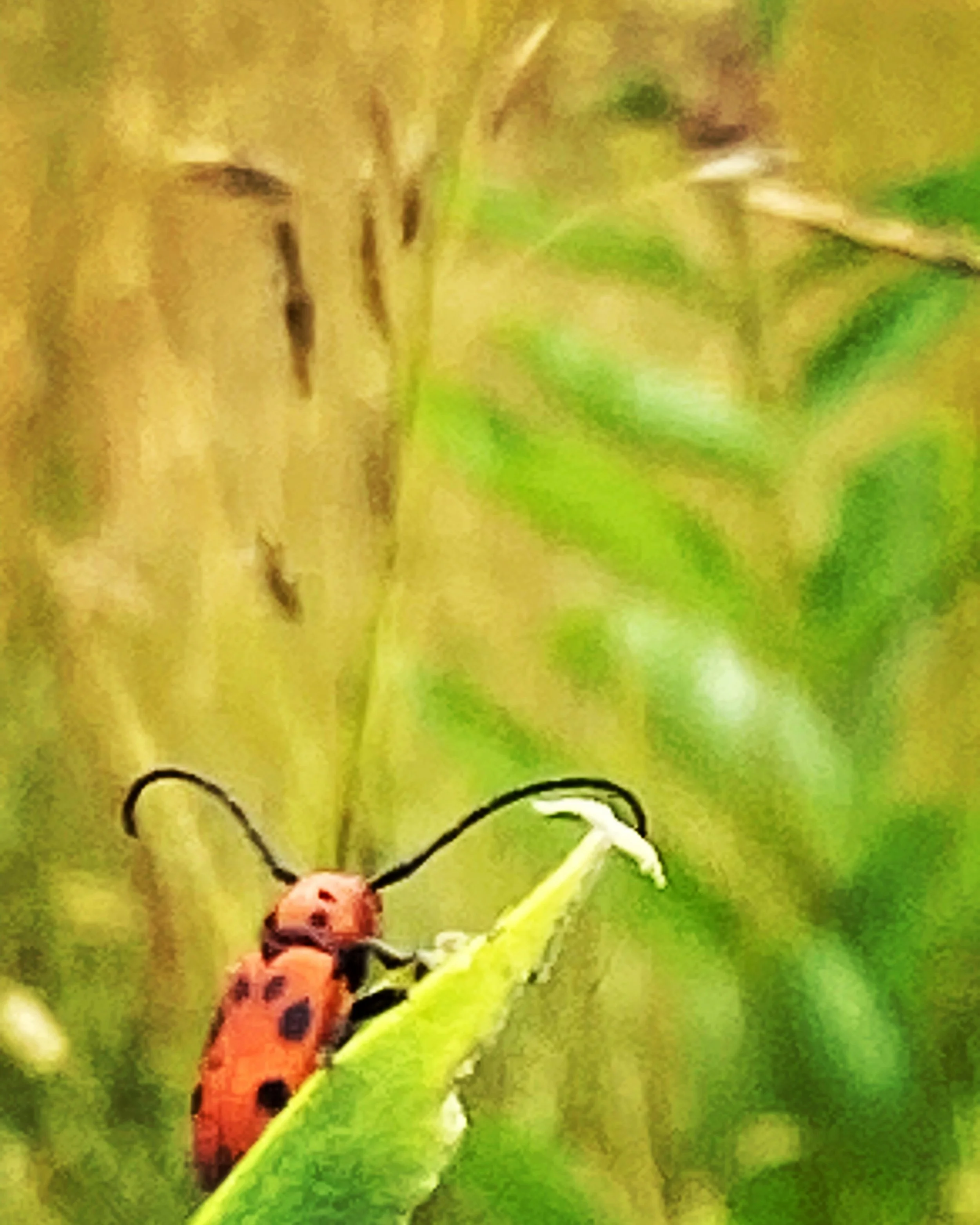 Rain! Rain! Rain! The good news for the land today is rain! First, it was so hot and humid. Charlie and I walked in Medfield State for a change of pace. I kept heading toward the sources of water where he could get a rinse and a drink on these trails, but all the brooks and streams were bone dry. It’s not unusual for these wetlands to shrink in summer. But with a heat wave coming, I knew the rain would be particularly welcome today. In the meadows, I found lots of milkweed, of course, and the milkweed beetle and also saw one monarch that would not stop for a picture. No monarch sightings yet on my milkweed.First, the rain was only a light sprinkling. That’s all? Oh no. And then it ended up raining well all afternoon. I could have taken a swim in the rain, but had already decided to take today off from the pond. And I had a good amount of work at my desk that I wanted to get done. I leave at the end of this week for a week at the International Women’s Writing Guild annual conference to run the play lab. My friend Laura, who has taken the Play Lab with me, shared this short video of a previous Play Lab with me this morning. I’m warming up for this amazing experience. Back for the first time since the summer of 2019.