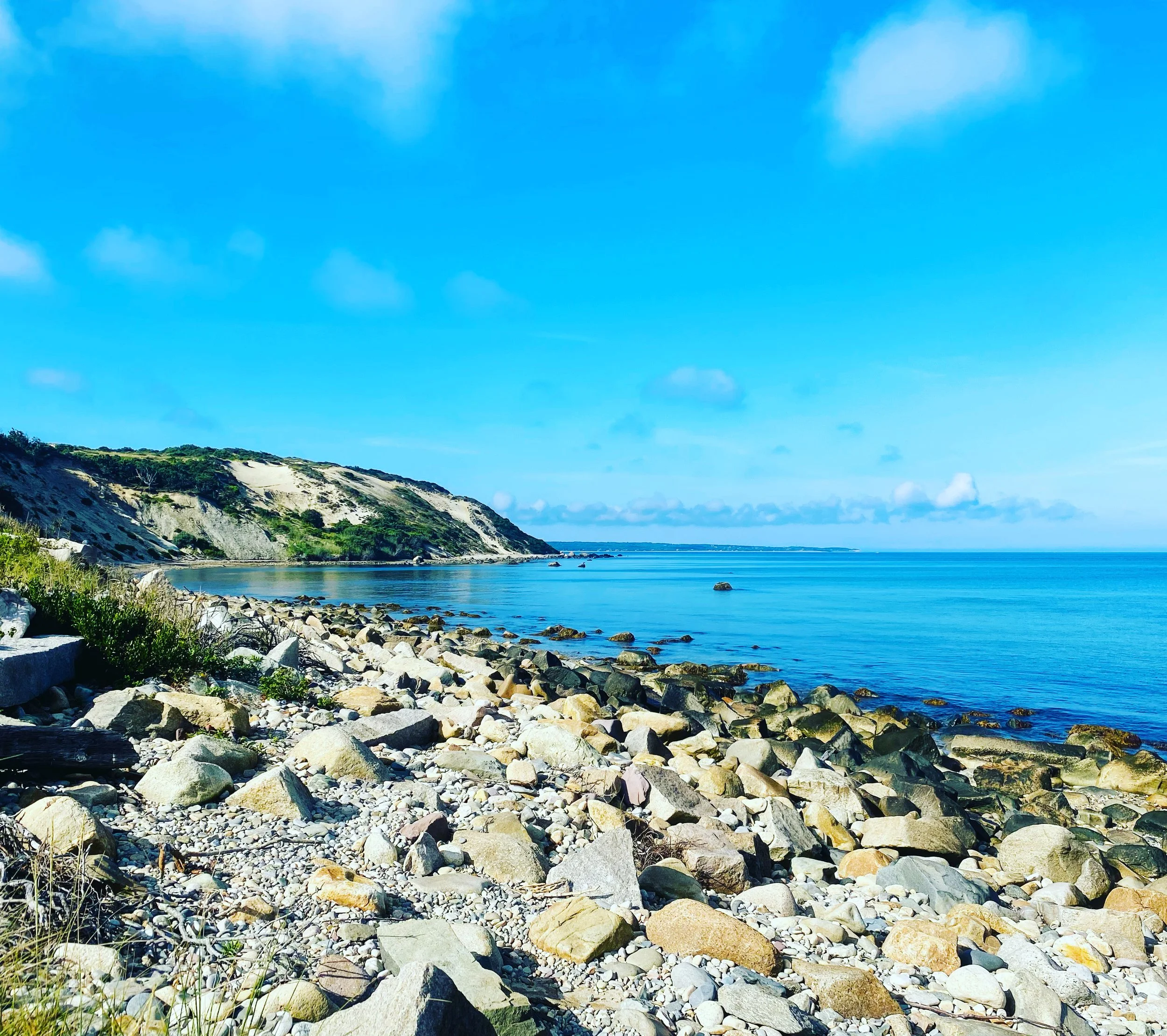 Sunny, bright, very much summer, waking early, the quiet house to be packed up. Frank gone to his meeting for the last time. Others, sleeping, I am not melancholy, as I so often am on the day of departure while packing. I am ready. When I have done my share, I take Charlie. We want our last hike and beach walk and swim at the Brickyard. It’s blue calm. Water as peace. I swim in blue immersion. I am saying thank you. Charlie is saying thank you. Charlie would stay here all day diving for rocks. He senses departure. He knows what my busy energy up and down stairs is all about. He sees the packages and bundles assembling by the door. But he is cheerful, bounding up the road of return with me. No osprey this morning. No monarch. Goodbye beach. I leave my walking sticks at the house for someone else to use. Soon enough, the car is jammed full of people and belongings, and Charlie! And we are on our way to Chappie for the day until our ferry at 5:20. So, we get an exquisite last afternoon swimming and sunning and sand playing and going over our favorite moments. We think about and plan for next time. Now I am home in my own bed, that isn’t really my own bed, because the house is in construction disarray, but there is great progress everywhere! It’s coming along so nicely, and