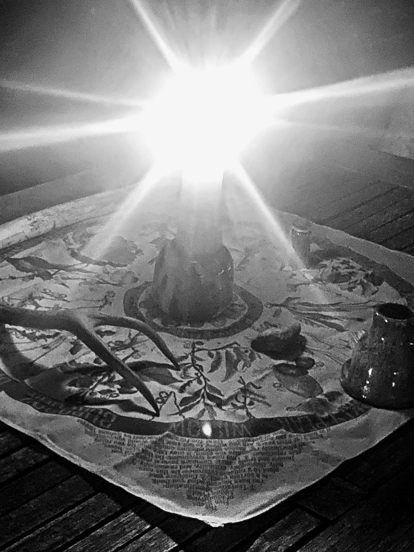 Stars in the night sky coming to light. A flock of geese honking overhead. Damp, warm night air. Crickets. The table on the deck, a candle, our chairs around it. We are home. My son has invited us to have a family council. It is after dinner, a dinner on the deck. All of us, and my father-in-law who flew in today as well. Not all of us can be in the circle. My youngest has to go to bed early to rise early and drive to a Playback performance in the Berkshires. My son has a new flute he plays to open our ritual. We all deeply listen and share what moves us, one by one. We go around the circle four times. I am feeling deeply moved and grateful for this unity, this intimacy under the summer starry night. Then one person abruptly leaves the circle, says goodnight. And I wonder why; but I know the why is not to be known. I could imagine a hundred reasons and still not know. I share about accepting when things don’t go as expected. This disruption deepens the circle in a surprising way. Isn’t that wonderful? I think about this afterwards. How because the disruption occurred something else happened that was special. This awareness deepened my acceptance. Another thing I shared was how special it was to come out to the deck and see the table set so beautifully for the ritual by my son, and the candle lit, and how beautiful it was to be gathered in the candle and starlight. How cluttered and disrupted the house has felt under construction, how hard it is to find a place to gather that feels lovely and attractive. And here it was, so simply and lovingly and intentionally created. I also think about how much I hoped my children would have a spiritual life. And how none of them have embraced a religious life, even though I wanted them to have exposure to this. And how deeply spiritual my son is now, and how he expresses this in such subtle and quiet and powerful ways. When I arrived home around noon today, I was invited, immediately, outdoors by an eager hand, pulling and pulling me into nature. This Special One wanted to take me to the butterfly bush where we touched the monarch a few days ago. There was no monarch in the bush for us today. But we were happy to have a look. Then we went to see if there was any water in the brook, and there was only the crusty black mud that we could pick up like crackers and crumble it up. Rain, I pray, for the brook and all the living things soon.
