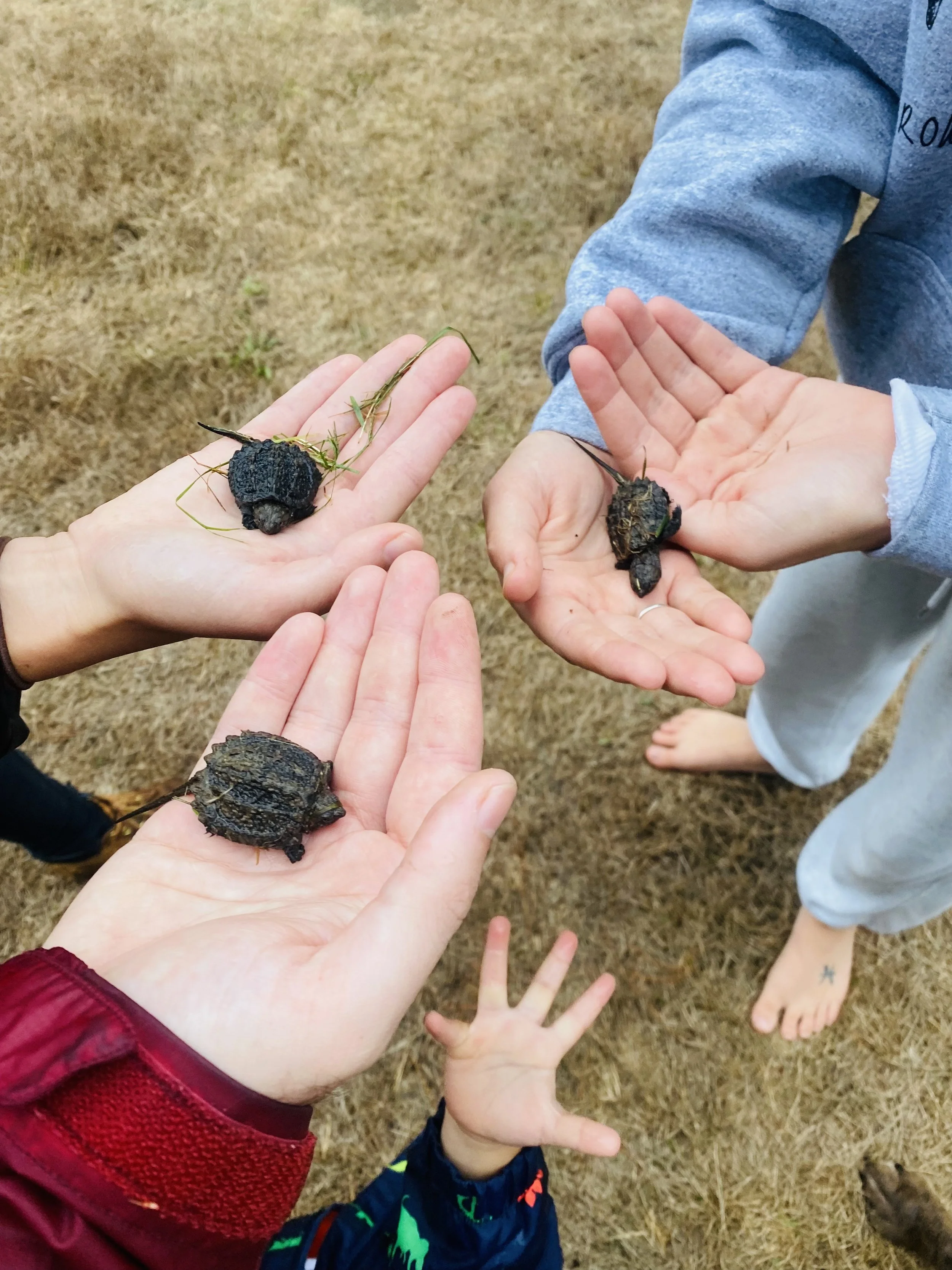 The rain made all the difference today. And tonight. A wonderful drenching. Starting late morning. Did not go for a walk until late afternoon. An insistent one coaxed me out. We put on raincoats. We opened our mouths and let in the drops. I wore my flip flops. All the bunnies sheltered. All the leaves were washed. Every hair on our heads, bleached summer blonde, got wet. The river was pelted. The brook still dry, not running. Maybe the morning? We finally went inside for dinner. But immediately, were all called back out. My youngest and her boyfriend were on their own rainy walk and they discovered that today is hatchling day! The turtles lay their eggs in holes dug in June. In September the hatchling eggs crack open, they dig their way out of the hole and must find their way to the river. The first September we lived here, twenty years ago, we found dozens for days, their slow march to the Charles. The yard had been uninhabited by humans for a few years, so the turtles had overpopulated. Now, there are fewer. See the picture with hands? Even Charlie’s paw makes the scene. We carried them across the field to the muddy river’s edge and let their journey begin. Tonight, met with Monday night poets. This morning worked on the poem I started yesterday. We had a wonderful session. Great poems and great feedback. I felt so grateful; we all did. And for the fine and steady healthy rain after drought and our terrific time getting wet in it.