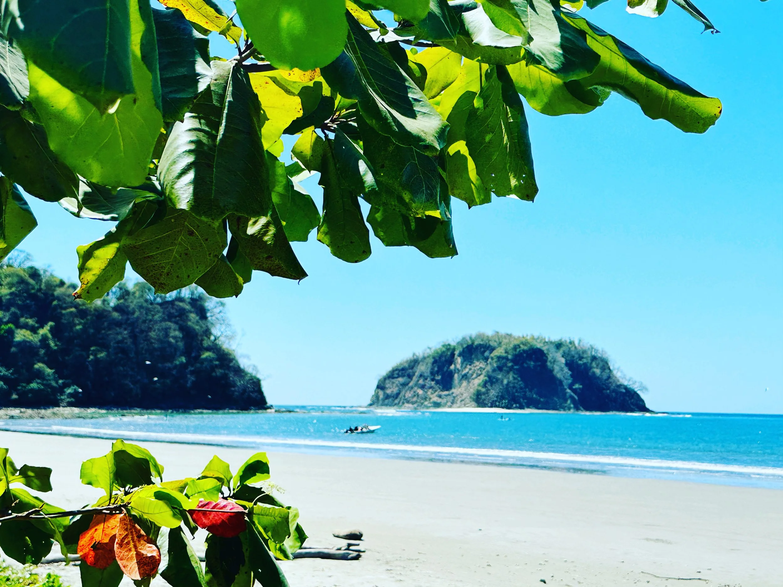 How is it possible I have never been snorkelling––until today? We did not walk. We woke early and met Victor, our local guide and friend, for our day trip to Samara, about an hour away. We had arranged for a sea kayak to some reefs and an island for snorkelling. It was sunny and hot, of course. And we had some wonderful views of fish and sea life—so intimate and engaging to be eye to eye with fabulous fish! We had lots of swimming and kayaking was not at all rough–and we saw a sea turtle! It was a splendidly fun morning, and then on to lunch, also in the heat and sun. Frank and I and my friend, Liz, went back to Nosara and the others went on for an adventure with Macaws. The rest of the afternoon the three of us spent working and resting and swimming in the quiet casa. Before leaving this morning, I woke at 5, as usual, and finished tweaking my poem to be sent off for my poetry workshop tonight. Last week, my meeting with my poetry mentor, Vanessa, was so worthwhile. We spent some time on the poem I sent off for tonight. I had told her I felt stuck; and she said, “Great. That means you can go anywhere.” And I wrote her comment into my notes of this poem I had taken apart and couldn’t seem to put back together. So, yesterday, when I opened the poem and saw that note, I got it. And the revision came. It was wise, helpful advice that allowed me to keep going. Tonight I went to poetry and the new version was very well received. My son called, on his way home to Massachusetts from Vermont and I didn’t get to talk but Frank did. Highlight of the day: the sea turtle sighting while we were kayaking. Even though I didn’t get an up-close encounter, to spot the turtle from a distance swimming with lifted head through the sea was just stunning. In the late afternoon, almost to sunset, I began a walk down the dirt road to have a swim and see the sunset on the beach but I read an e-mail and thought I needed to attend to something. Returned home unnecessarily, but got to have some quiet time with Frank by the pool to just talk and connect. Found the lovely blossom on the hot gravel road.