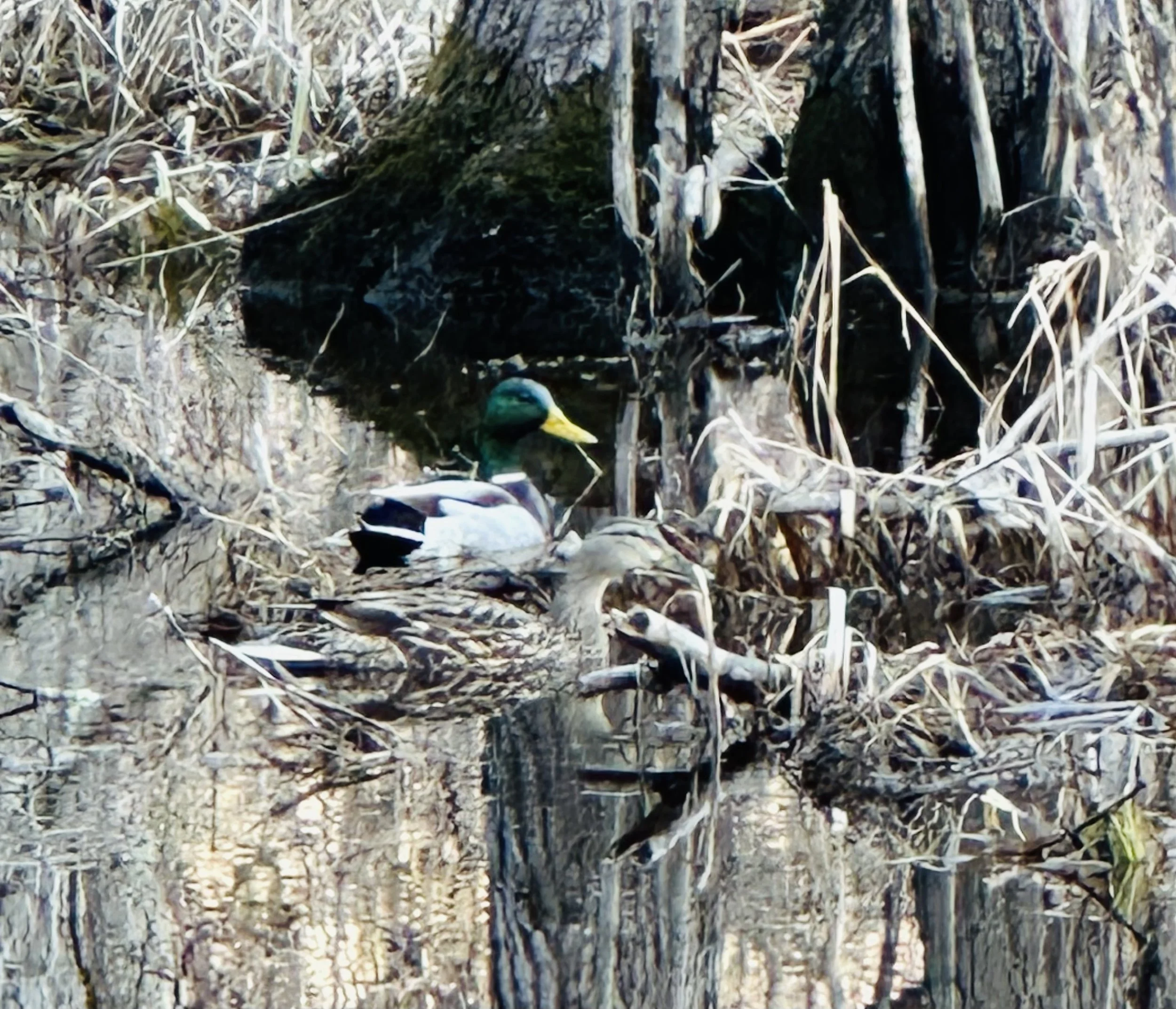 One thing about releasing my book––dreaming about my mother. Dreamt of her again last night. A recurring theme of her senior years: that she got lost in a nursing home for years and we couldn’t call her or reach her or visit here, and didn’t know where she was and she couldn’t tell us or find us. The dream makes me so sad. But it feels connecting and intimate in a strange way too. It makes me conscious, simply, of missing her and wanting to find her. Waking, Frank home and we have coffee and conversation early. Then, I get back in the pool which feels wonderful after four days, and I have my usual energy. Charlie is waiting for our walk. It’s still frosty in the morning, but no ice. I find an interesting piece of old mail, a post card, in the woods, lost from a walk home with too much mail some time in early winter. It has seasoned in the weather like an ancient painting. At the brook, at the end of my walk, on my return, I see them, still and shining on the currentless surface: Mr. and Mrs. Mallard. She is so camouflaged; he is so emerald-headed. A lovely pair, but the special one isn’t with me. My day is busy with group and writing clients and then, in the late afternoon, I know there will be a need for my homemade pizza for dinner. I make a huge batch, happily, and it’s enjoyed by all. I’m so happy to be back swimming; I feel the charge of it enlivening me all day.