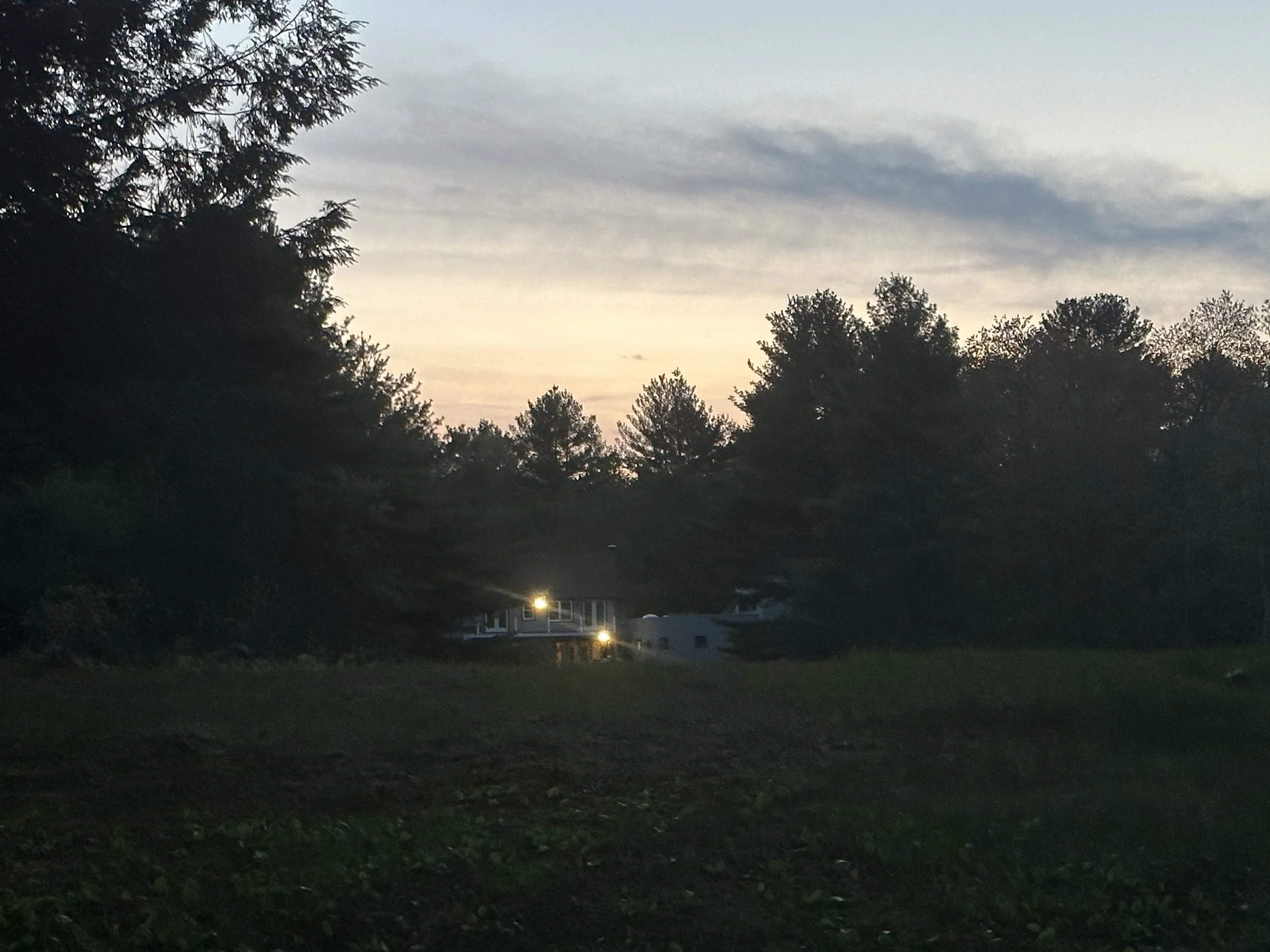 A day, a walk. A day when a walk is prayer. Prayer as listening, and letting in the sounds in the absence of talk or human noise. Nature only. Wind through trees and aspen leaves. Meadow grass soaked, and my feet sloshing. Blackbird after blackbird shooting across the river, in and out of landings on branches. Letting myself listen, too, to the prayer of my body, saying what it wants. To feel what I feel and move my feet and eyes. Let there be tiredness. And also gratitude. Let the gratitude come. Then, home. At my desk, writing and sending my newsletter out. Gratitude to have that done. House quiet today. In the late afternoon a visit from my friend who has been away, is back home, and the sweet chance to hear about her journey. Dinner with both daughters around the table, the doors open. A late rainstorm, a rainbow. Playful fun and laughter. Frank and I walk, nearing dark, across to the river and back. Lights on, home across the meadow in summery weather.