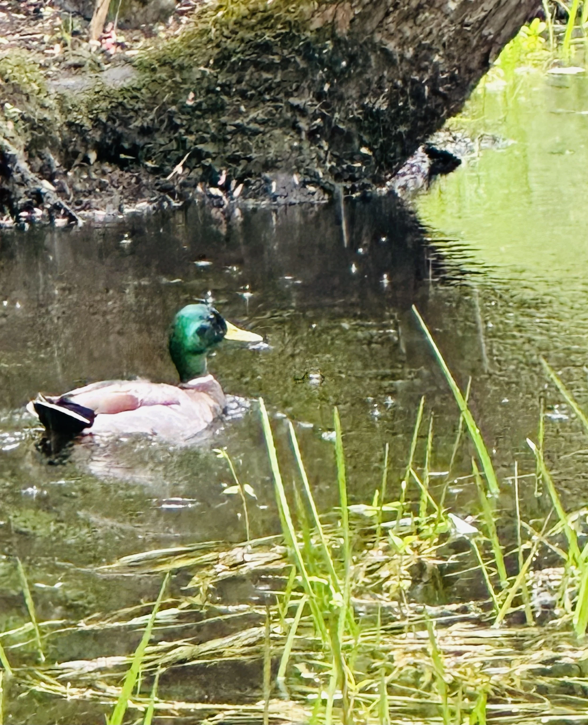 The forecast is rain. Frank is gone when I wake and I am not in any hurry. Except this is the day the seedlings must go into the ground. Frank comes home and wants to get the gardening done, and so we go out into the cool and damp morning. A nice breeze, but no sun. Zucchini and yellow squash rows, two of them. Boxes for lots of tomatoes, cherry and early girl and hybrid. Boxes for eggplant, boxes for cucumber, boxes for pole beans. I plant them all; Frank stakes the tomatoes and makes climbers for the beans. A drop of rain here and there. It’s coming soon. We think about the special one, not here with us today, who will come tomorrow and find the garden planted. My friend calls and we connect from across the country, coast to coast, while I water all the seedlings. Sprinkling from hose and sky. The planting done, I walk and talk, passing my friend the mallard on his brook swim. Once I am home it rains very heavily. I have housework and then a long, long lovely nap with the door open to the yard and I sleep so contentedly with the pouring rain and the vegetables in the earth, as if I can feel them settling into their new habitat, feeling the rain pooling on their roots; their energy is green and hopeful. Quite a drenching, quite a resting.