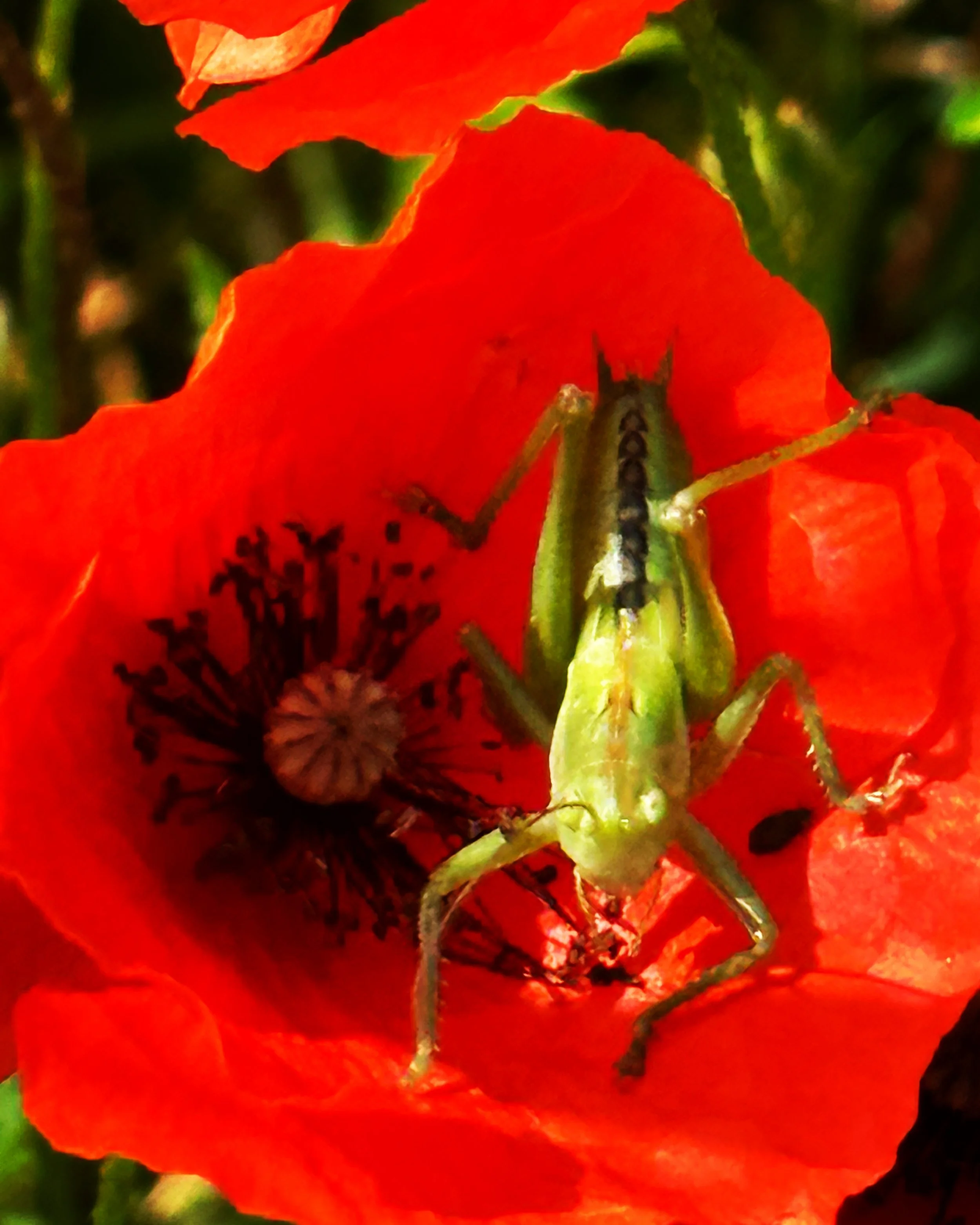 Lost my sleeping spell last night, awake until 4:00 a.m. I listened to the novel I’m reading on Audible, “The Hired Man,” another novel set in Croatia as we will travel there in June. Then Frank woke me out of a sound sleep at 8 for breakfast. Our friends have just put in an in ground pool in their back yard, and it’s lovely. But there was a lot of excavation and much of the yard was dug up. All around the dug up earth there are lovely wildflowers growing, including the charming poppies in bloom. As I sat waking up in the sunshine with my coffee before breakfast, I watched the excavator come in and scoop down and take a big bite of earth full of poppies in bloom in its mouth and turn the earth over to fill a hole. It was a shocking moment. So, on my walk later, along the riviere eyrieux ardeche, I felt so delighted to be in the hot sun, and along the roadside, paid a lot of attention to the poppies. Found the grasshopper enjoying them too! Today I had two swims in the pool and ran my Ukraine group as well. Lovely meals on the terrace, simple, fresh, delicious meals as only the French can do so naturally. Cheeses and baguette and salmon and spinach and fruit fruit fruit. Tomorrow we head back to Paris on the fast train. I am so happy to be here. But that doesn’t mean I don’t think about the special one throughout my day. Especially when the big teeth of the excavator started eating the poppies!