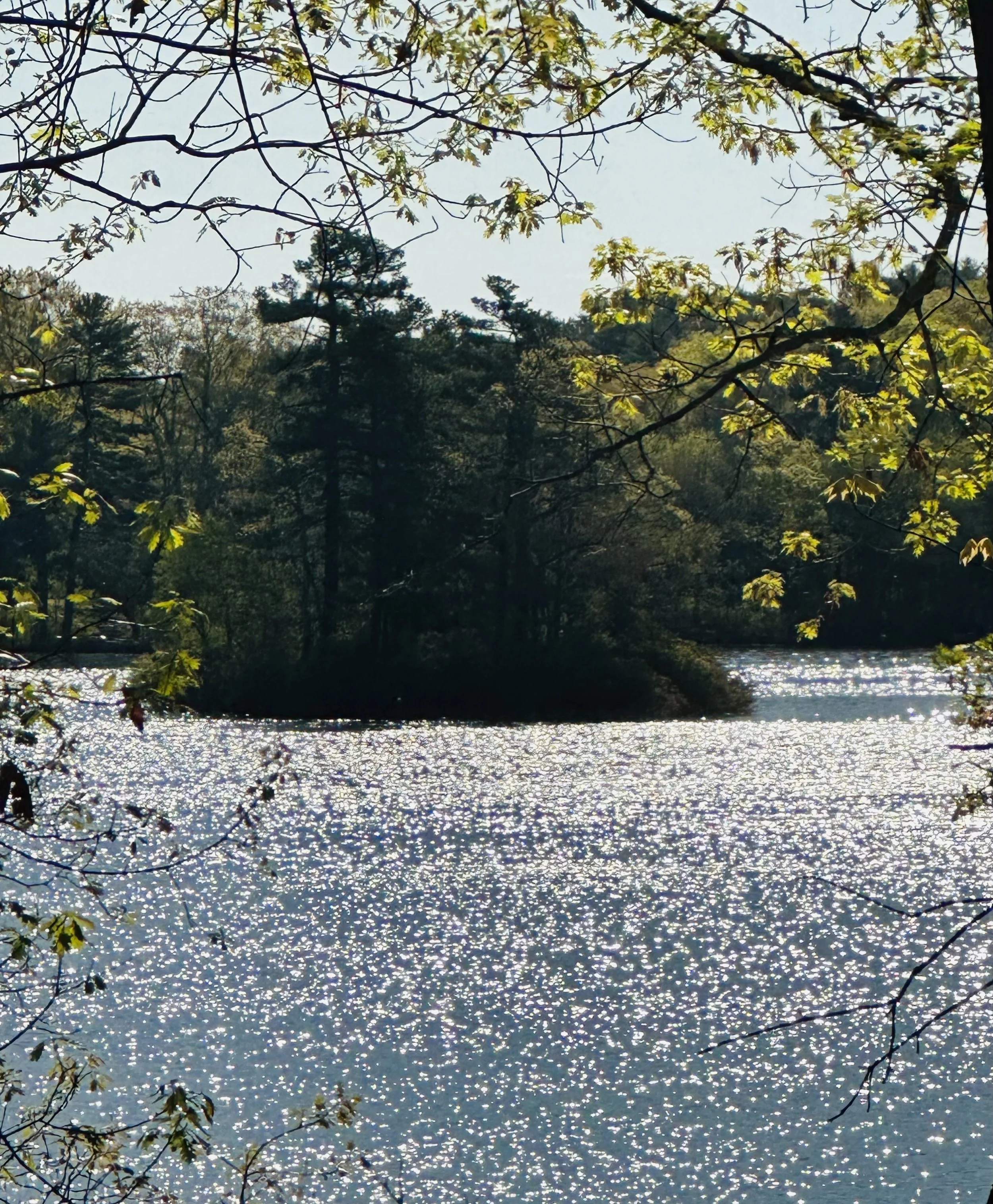 Here is the best kind of Monday: it’s early, only 7:30 a.m., and sunny, and I am in charge of spending the day with the special one. Yes, he would like to go to Farm Pond. And by 8 a.m. on a sunny spring day we are there in our bathing suits, the beach deserted, and one swimmer crossing the water near shore in a wet suit. Sun brimming, lake lit so brightly. The Island surrounded by sparkle. All we have to do is play in the water and sand. As much as we like. As long as we like. There is nothing to disturb us. And there are plenty of toys in the toy bin. Yellow dump trucks, a bull dozer, some shovels and pails. We get wet to our waists. We look for fish in the water. We climb onto the docks. When we are tired we head home. There is one unlucky incident of tripping on the parking lot pavement, some scraped knees and tears. This day is outdoors. Except my one meeting online with my poetry mentor. I have risen at 4:00 a.m. to prepare to work with her on my manuscript. And then there is the chance, while he is sleeping in the afternoon, for my own nap. We eat dinner outdoors. It is a summery, hopeful day full of gratitude and play. The special one wondered why my manuscript pages were scattered all over the floor of the den. Did I make this mess? Yes. And I’m cleaning it up, making order. Doing my best.