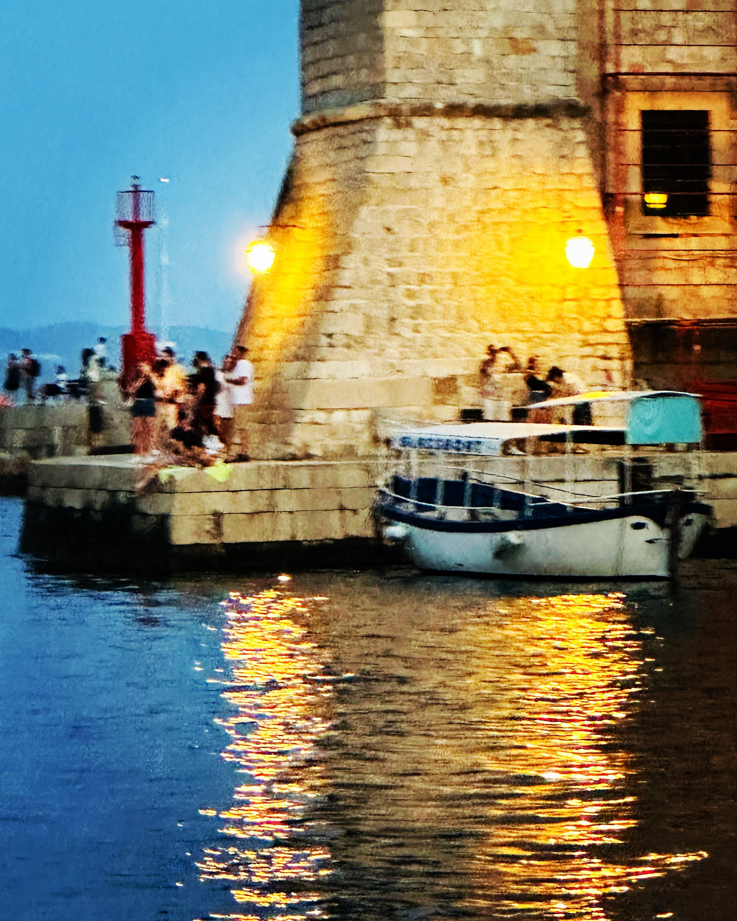 Our third day on the boat; today, late afternoon, we reach the coastal city of Dubrovnik where we spend the afternoon sightseeing and climbing the walled city for spectacular views, learning the history, and taking a luscious swim. Such a hot, hot day in this “city of stone and light.” I was a bit miserable for a time. But we walked and cooled off in the water, changed, walked the wall, and had dinner at a lovey restaurant. A fabulous day––splendid. Tonight, strolling the white stone city as the moon rose and darkness fell around us, in a mass of happy tourists, I asked Frank if he wants to marry me, again. Tomorrow is our 36th wedding anniversary. He said yes. Our boat is parked in the crowded harbor and we are docked next to a party boat, music blaring. They have to shut off the music by 11:00 p.m. thank goodness. We are tucked into our tiny and comfy cabin.