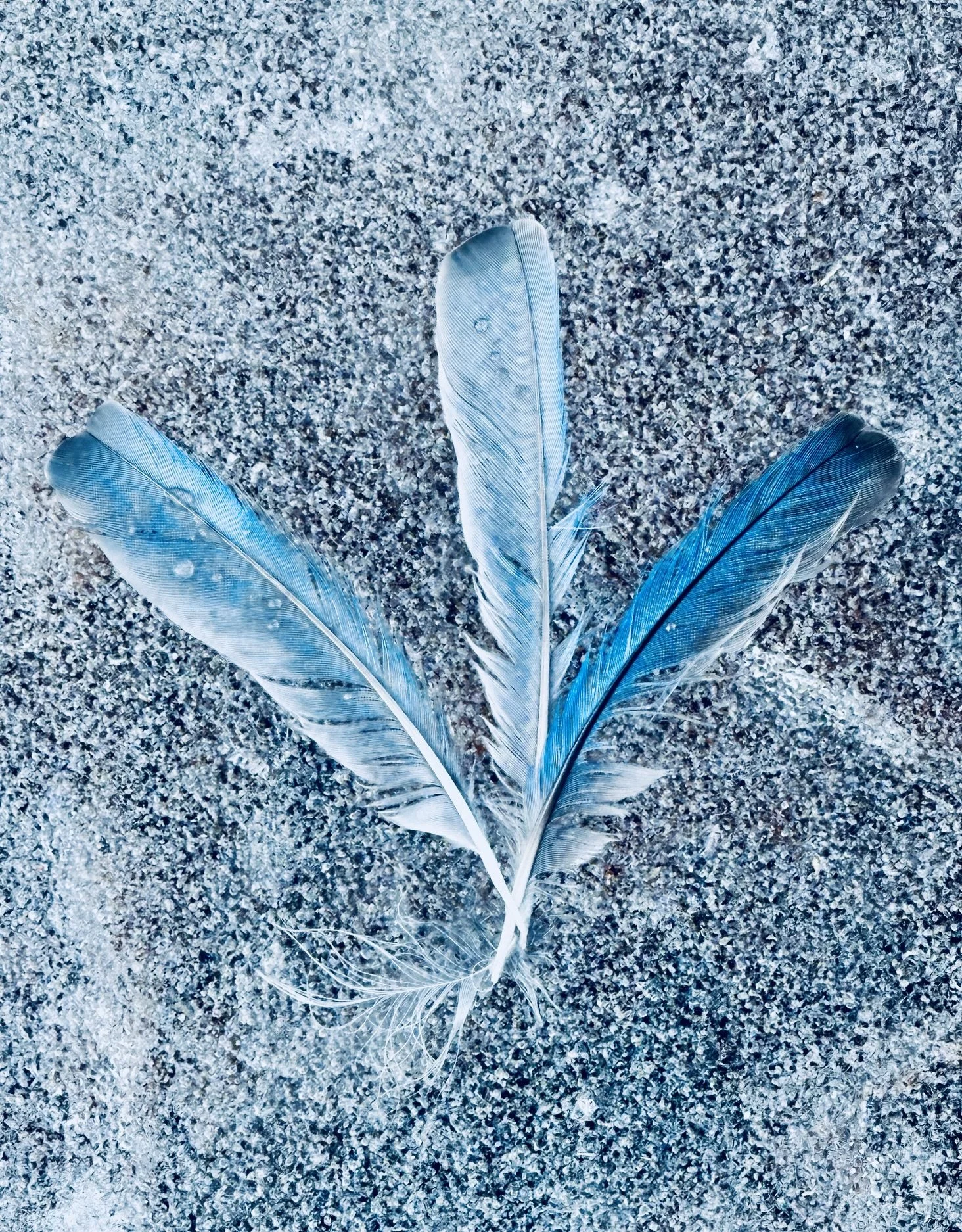 Sun! What a boon! Waking with sunshine outside really was a lovely change and I felt so encouraged by this energy jolt. So much winter sky, I hadn’t realized how good the sun would feel. I decided not to swim and to just go outdoors, taking my time, an unscheduled day to full appreciate. There was lovely ice, and I found the most amazing thing: this arrangement of blue jay feathers on the ice in our wetlands. A bouquet of feathers, fallen from sky. I felt sorry for the blue jay, because there were many feathers around. But these arranged so artfully by chance. Another spontaneous cheerful gift. As I was walking Frank called from the winter tent where he was with my son dropping off some recent purchases, so I turned back and joined them to chat inside the tent for a bit. We didn’t light a fire because they were off to buy some more wood. But it was lovely to be there, relaxing for a bit. Later, I worked a bit, submitting some things. Then, a much needed massage. Met Frank and friends for dinner, casual and so fun for a winter night. Today was about regenerating, renewing, resting and relaxing. I’m grateful for family, friends, February and feathers.