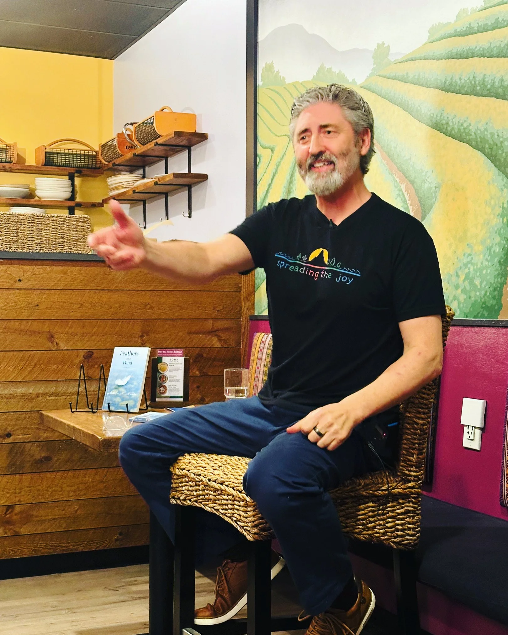 Tonight, letting Brittany into the yard, there is a half moon and stars above me. I have played dinosaurs, and cleaned up the kitchen. I have been to a book launch and talk by my friend, Ed Williamson, at Nirvana, his tea house in Millis. I was honored to introduce him for his reading. Seeing him follow his dream of having his book, Feathers on a Pond, published, has been wonderful. It’s a challenging process and it takes a lot of assertiveness and confidence to publish a book, especially your first one. There was sunlight in the current of the brook this morning after my swim. And my poetry workshop went very well; my poem revision was well received. I continue to plan my writing retreat on Friday to work on ordering my manuscript. I am imagining some creative ways to be enthusiastic about this––to find just the right way that will serve my poems and imagination.
