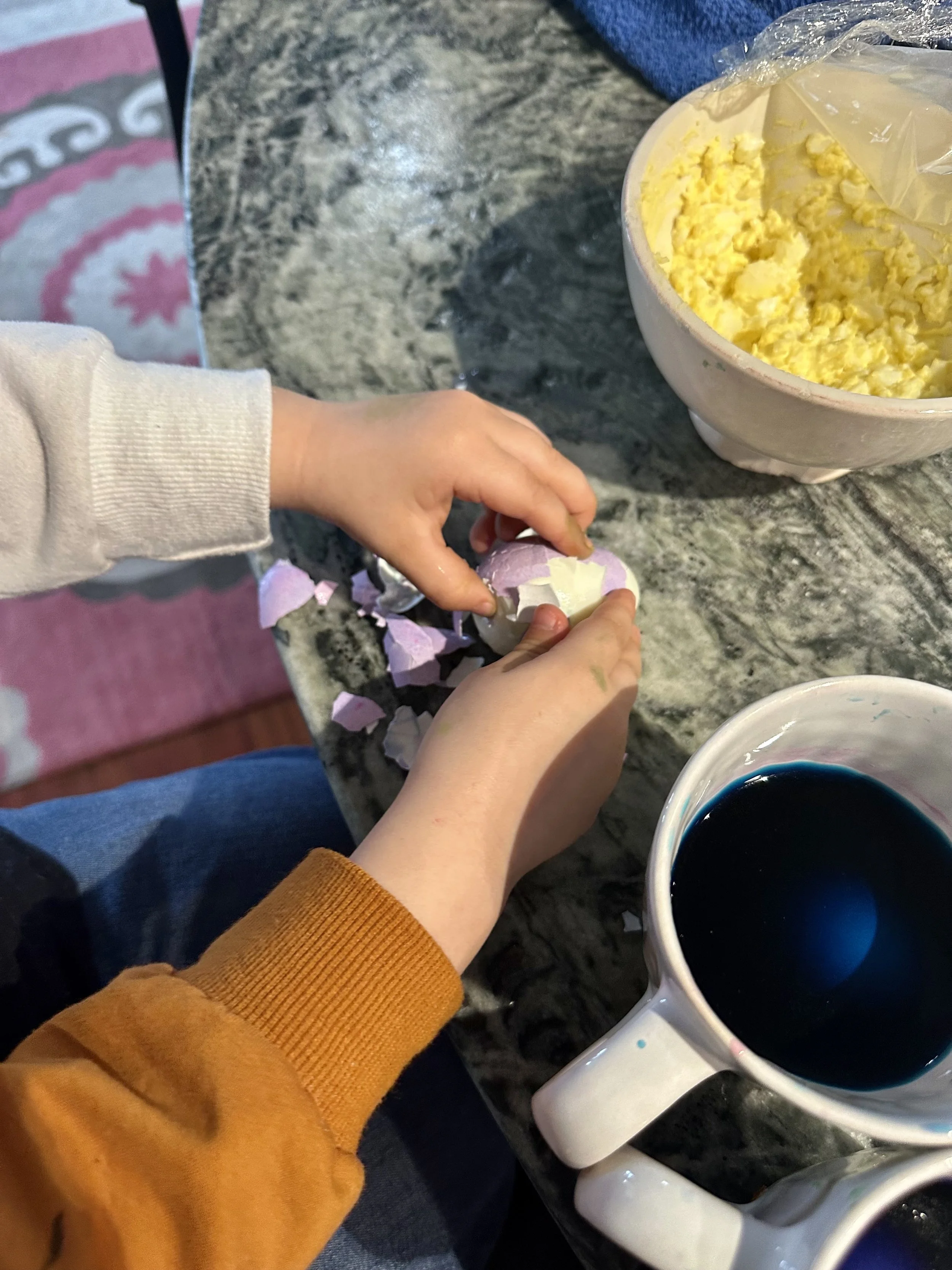 I woke at 5:30 so I could get a swim in before a busy morning. Back in time to attend an online meeting with the Ukrainian therapists professional group, which was very worthwhile. Also watching Wave while I did this, who only occasionally interrupted because his egg sandwich kept falling apart. My daughter was at work and no school for Good Friday, so I spent the day with Wave and we dyed Easter eggs, made egg salad, and filled about 100 plastic eggs for his Easter egg hunt in the afternoon with his friends which we hosted. I fell asleep for a nap and didn’t want to wake up, and he fell asleep beside me, but we had a party to put on, and all of those eggs had to be hidden in the yard before his friends arrived. He slept on and I got it done just in time. It rained all day until early afternoon when the sun came out just in time for the party. Tonight, I opted out of pickle and let them all go off without me. I have reached my limits today. I need some quiet and some rest, with a fine and satisfying day behind me. Had two images accepted for a journal today. Got a nice hug from my daughter who thanked me for making some Easter fun for her son.