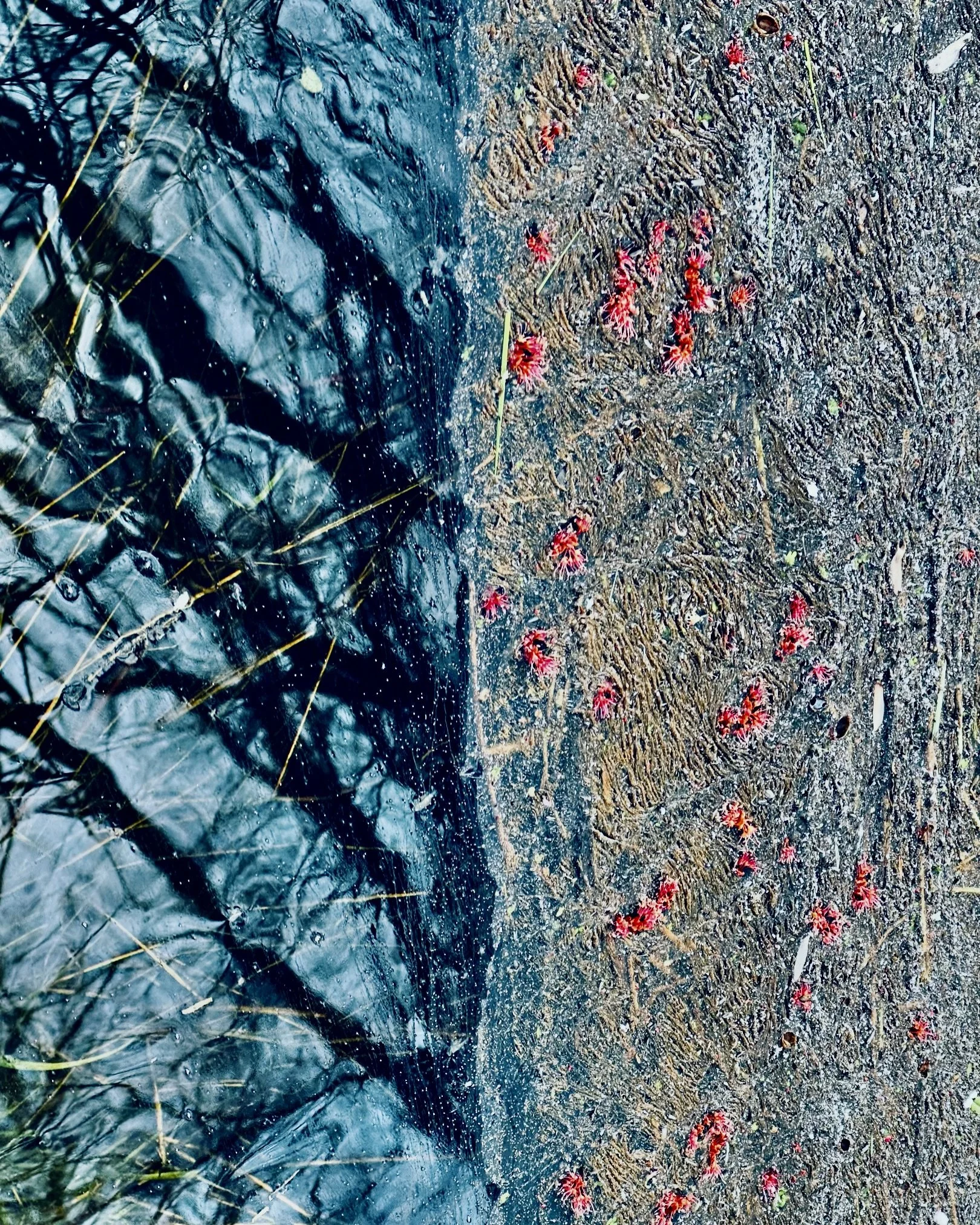 I make crepes for Wave at his request. He asks for Aunt Franci’s favorite, having learned that this is her favorite breakfast. He is very satisfied, and that makes me happy. Once again I feel more like walking. Actually, I don’t feel like walking or swimming. I feel blah from this weather or whatever and I have a cranky voice in my head. But I walk anyway, and on the way home I wade in my sneakers through the overflowing brook - and this is when for the first time this morning I find a picture that makes me smile. The little maple buds in a scrim on the brook’s surface with the tree’s branches. I just feel a squirt of happiness. But I also like the picture I took while standing from the trestle bridge over the Charles, the surface of water in stillness under a placid and colorless sky. Brush strokes. Breath. Stillness. Then I take a short swim after that, and head off to meet with my Ukrainian friends on Zoom for a chat and connection, which we do once per month. We do some drawing and it’s really lovely. I get my newsletter finished and sent out and then tea with a dear friend brightens the afternoon. The cranky voice is quiet tonight. I downloaded “My Struggle, Book I,” by Karl Ove Knausgaard last night to listen as I went off to sleep and the opening is so dark––smart and thoughtful and intriguing, yes, but very dark–– I turned it off and returned the book this morning. I’m sure it gets better. Maybe. But I’m not going to find out. I am thinking about reading “James,” the new book by Percival Everett. But I’m being fussy, quite fussy about my next choice. Waiting. Audible will not let me return another. Meanwhile, my hardcover second hand copy of a biography of the poet Louise Bogan arrived and I might start that instead.