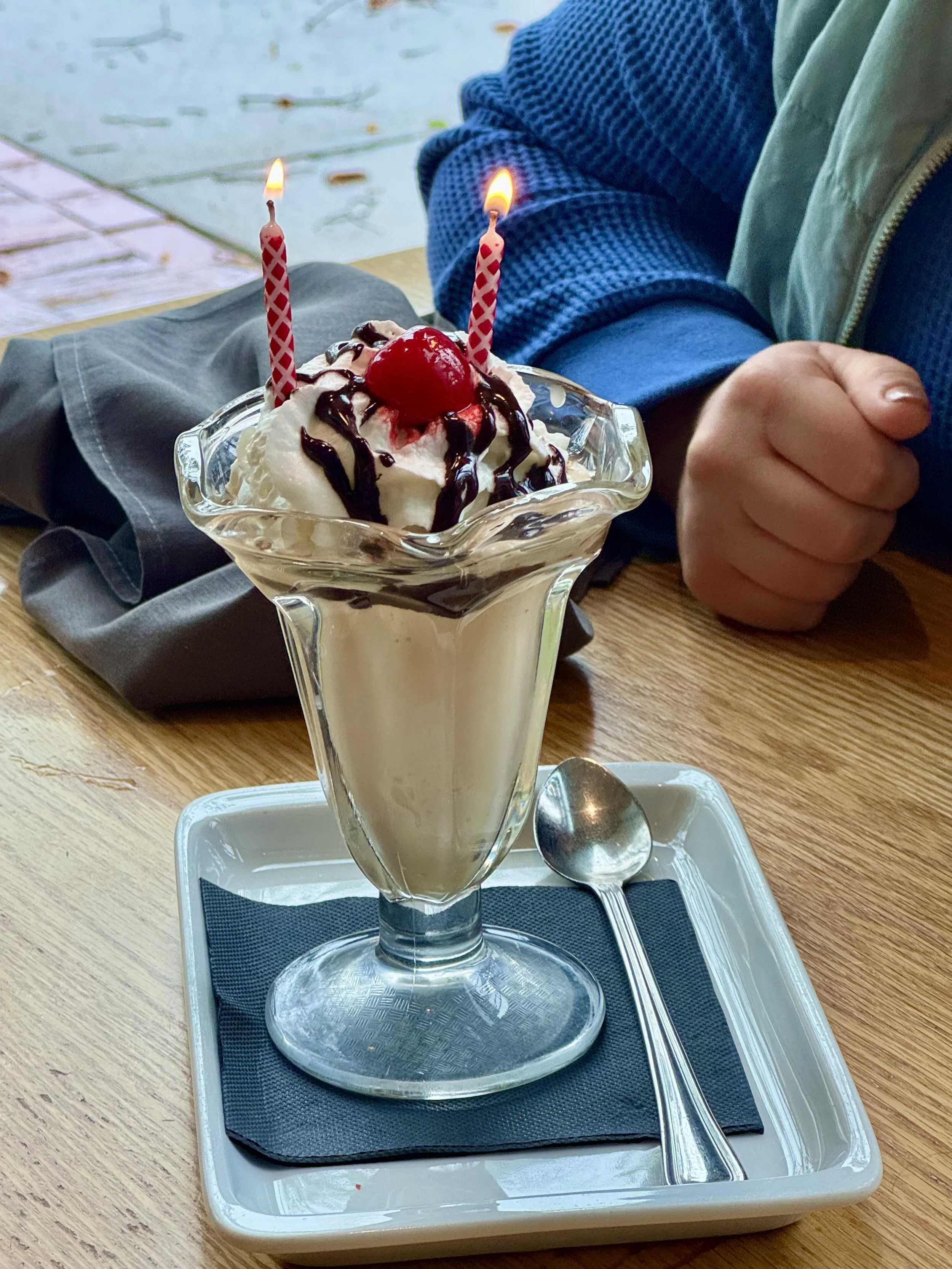 First of all, storm. Rain, wind. Wetness and the blessings of it dramatically outdoors. And I tweaked my lower back yesterday. I overslept. I mean, 8:30 a.m.!!???? But I couldn’t get to sleep early enough and decided a storm was a good reason to rest. I drove up to the high school track to walk in the rain because I do that when it’s not safe to go into the woods. And I didn’t have enough time to think about a swim. I grabbed a half and hour on the track and went home happily wet. Workshop. I felt really good in workshop today. Grateful and the conversation was really interesting and insightful. My poem also got helpful feedback. Then I scooted off for a lunch with my daughter and my dear friend and her daughter, the four of us lifelong friends (since the girls were babies.) And today, celebrating one getting engaged to be married and the other just passing the Bar! It was a joyful, fun-filled lunch. So sweet to be together with these milestones. They were only months old in our arms when they met at their older sisters’ kindergarten orientations. And, of course, the hostages, the twenty living ones, a homecoming. All that poignant news. And then our power was out afternoon into evening. Around 8 p.m., Frank, Perri, Wave and I got our umbrellas and flashlights and walked the long driveway to the street where Eversource had trucks, fixing the line downed by trees. It was a pleasant walk in a light rain. A short time after we were back inside the lights came on. So, the Sunday pictured here was brought by the waiter as a surprise to our girls who promptly shared it between them on this celebratory day.