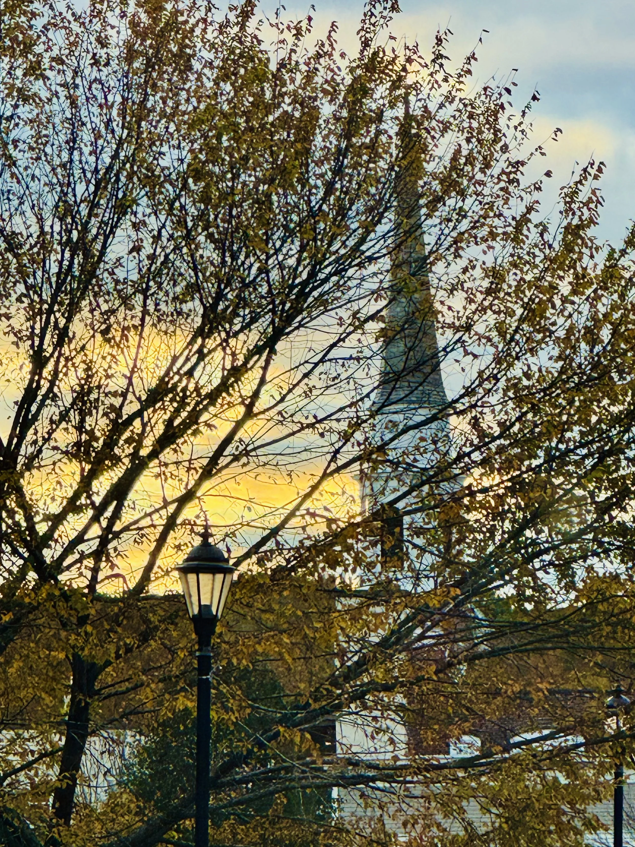 Back in the pool again this morning. Good laps. Then a quick shower and hit the road to visit my aunt in Connecticut. So much pretty foliage along the way. My aunt cheerful and lovely as always. How lucky I am to have her. I stopped on the way home from my visit off the highway and was able to meet with a client from my computer in my car. Home in time for a quiet dinner I picked up at Whole Foods with Frank. After he showed me the work he did clearing brush. It was almost dusk. A lovely quiet night for watching tv together. The Diplomat. Feels like a wintery night. I took this picture while driving through Wellesley. The streetlamp, the steeple, the sun going down, and the leaves as well.