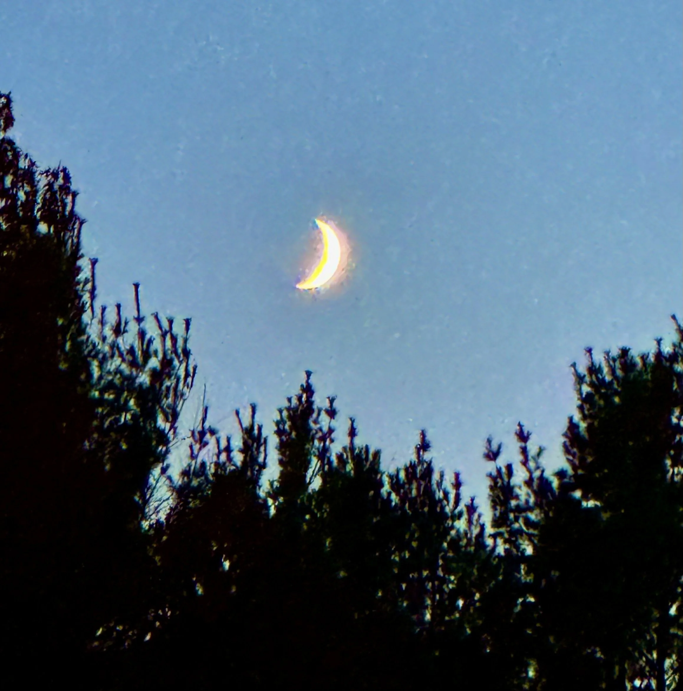 No alarm set for my birthday morning. But it’s not quite 8:00 a.m. when I wake up. Wave is soon beside me. We are playing Minecraft. I am not familiar with game. What I enjoy is his pleasure in teaching me, teasing me through a portal where I will NOT get any birthday balloons. I had a dream I needed to dive into a large foamy ocean wave and swim across a body of water. I was a little hesitant, careful. Making sure I knew I could actually swim this wave. And then a guide kind of pushed me in, and I did just fine. That set the tone or me, a lovely birthday. Tired from yesterday, and quite happy. Lots of treats, messages, and sweetness in the day. A visit from a dear friend with lovely roses. A package to open from my Ukrainian friend full of fun items. And a t shirt from friends that was PERECT or a swimmer like me. A necklace Frank brought me from his trip to New Mexico—lovely. Not just the tree trimmer! Best part of the day, one of the best, playing pickle with Franci and Will on our finished court for the first time. Being out in the true autumn, almost November, past the foliage peak, surrounded by dear trees I love so much and feel so intimately connected to––and the call of two great horned owls at dusk. And winning - we beat them twice! And the cool moist air and a birthday dinner ahead. Walking across the yard after it’s too dark to play anymore, toward the house, toward dinner. Everyone there. Lots of laughs. and then getting my birthday appreciations from everyone—especially satisfying. My daughter Perri saying “I love how you are so intelligent and fun to talk to.” Swoon. How lucky I am. Mostly teasing from Wave. Franci suggested also that everyone go around the table and offer one line of a spontaneous poem for me. Which was sweet and hilarious. How lucky I feel for this birthday. I closed my eyes and said thank you to my mom and dad for bringing me into this world. Under the birthday crescent moon.