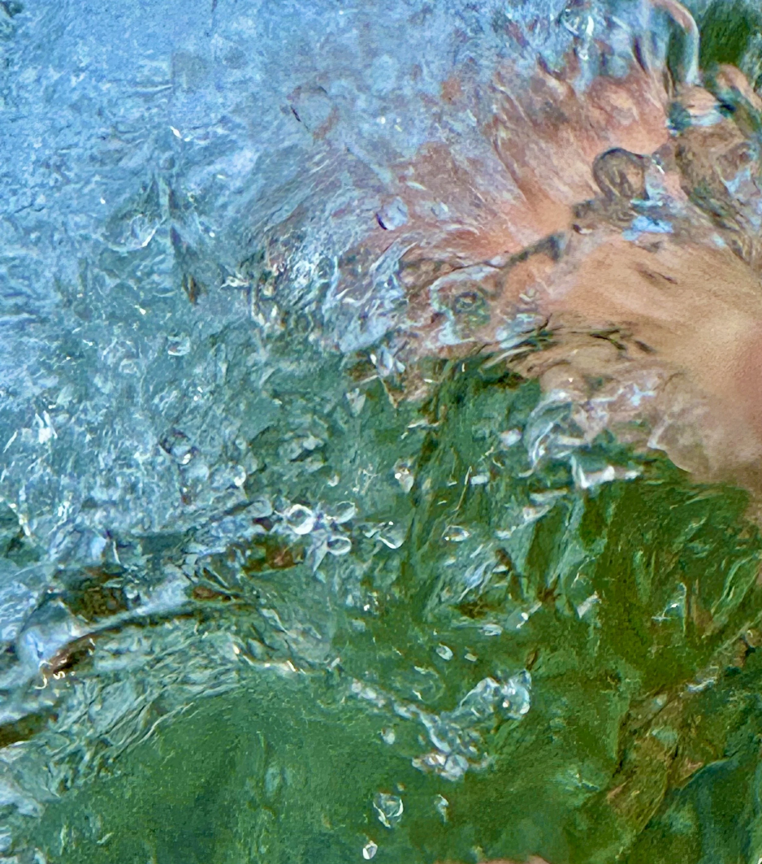 My daughter Franci has been seeing bald eagles at Farm Pond in her late afternoon swims. She says there are three nesting there, at least three. And I had the great good fortune to see one today! Late afternoon, I drove to the pond, and Wave and his mother walked. Well, Wave rode on her back! Arrived and gleefully told me as I waded in the water, waiting for his arrival, he wasn’t tired at all! That’s when I saw the eagle dip from a tree on the edge of pond and rise again and soar away, its white head glinting in sun. After Franci arrived we saw the eagle soaring again on the other side of the pond. The pond was crowded in the afternoon with children and parents swimming and playing and the swim team practicing. In the morning, when I swam before poetry, I was virtually alone out in the middle of the glass pond. No wind. Very warm. I had a great swim. Frank left before I woke. My poem was well received and I got good comments in workshop. Woke early and worked on the one that is challenging me and I thought I made some progress. We’ll see. I’ll revisit it tomorrow. I bought another batch of juniper for ground cover and a few more hydrangea to finish the project. It was hot mid-day, but I placed them out and found I had just enough. Too hot to plant them all—there are 25, and tomorrow will be hotter, but early, perhaps, I will try and get them in the ground. So nice to have Wave home. He asked for breakfast: dipping egg and blueberry pancake. Orange juice. And then, when I came back from my swim, he wanted the whole breakfast again. And so it was served a second time.