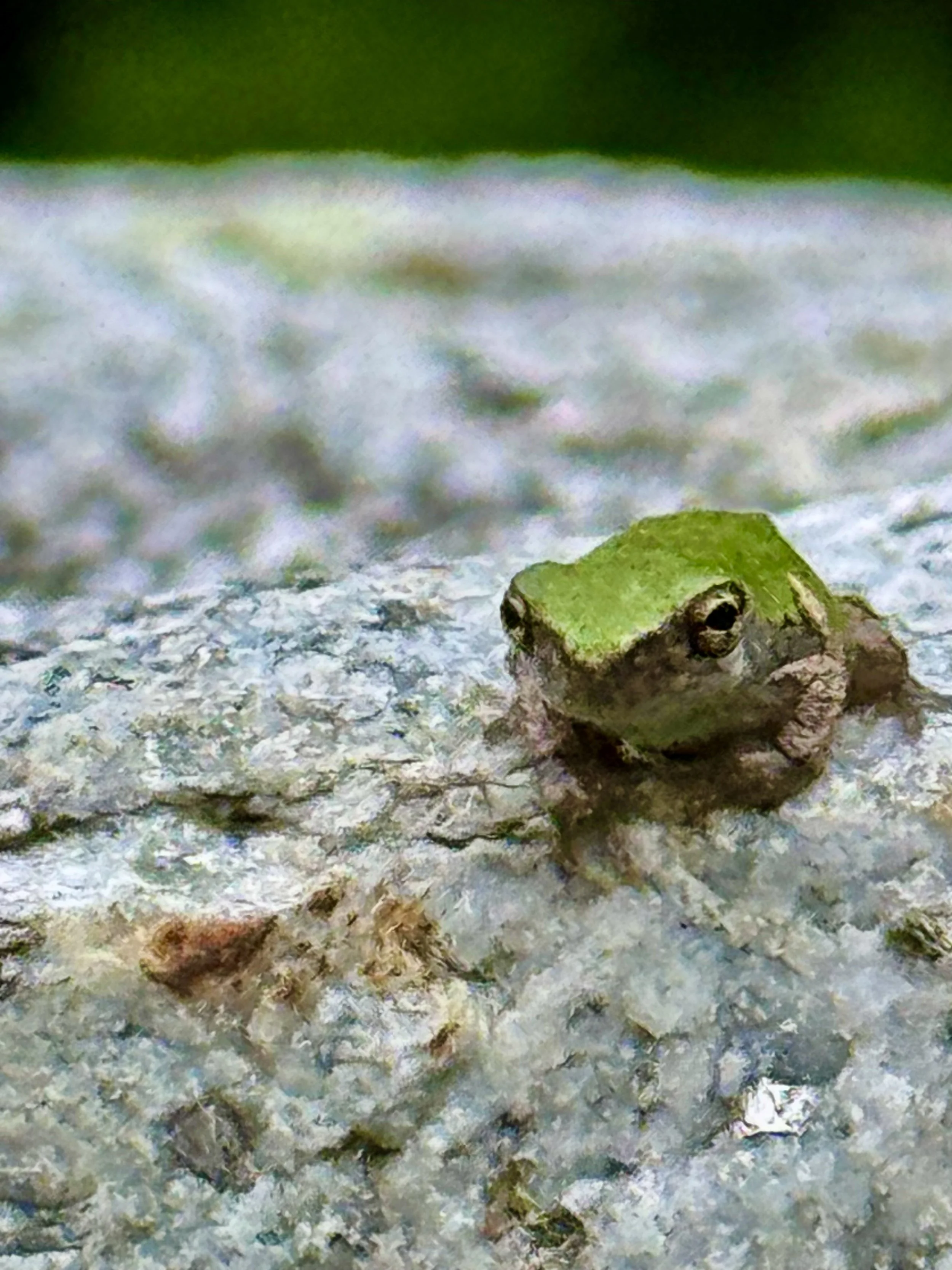 Up early into the cool morning. Still overcast from the Canadian fires. Stayed that way all day. I went for a swim, a good one, and did not see the eagle this morning. The water was quite calm. I wished for a bit of sun to come through the haze. Oh, before that, I forgot. I had to retrieve my neighbor’s husky. I had planned to walk to the pond and back after watering my flowers, and so I tied my swim buoy around my waist and put my goggles and cap in my pocket and started walking through the woods. Stopped right away at the brook by seeing a guy on a bike with a husky. At least I thought it was his. But he had just stopped because the husky seemed to be lost. I told him it was my neighbor’s dog and then I tried to get Ren to come with me, but she wouldn’t. She kept running further and further away. The guy on the bike was nice and helpful. We managed to corner her on the railroad tracks after a bit of a chase, and I used my swim buoy as a leash and walked her home. So, then I decided to drive to the pond instead as this had taken a good amount of time. No writing today on my poems but I got a course proposal sent in and some art submitted to a journal. And my Israeli group. And a visit to my friend’s garden for tea. And then I took my nieces out to dinner which was really really special. Perri insisted, late this afternoon, that I come down right away to the deck. She had found a very tiny frog and she knew I would want to see it. The frog was sitting on the granite post by the deck, and truly, it was no more than an inch! The tiniest frog I’ve ever seen! Perri has been noticing nature intensely this week and sharing it with me and I’m appreciating her eye and her awe. I very much enjoyed meeting the little frogling. And I wondered why Mother Nature would make such a tiny little frog. I wonder what his role in the habitat is. Why is the little one here?