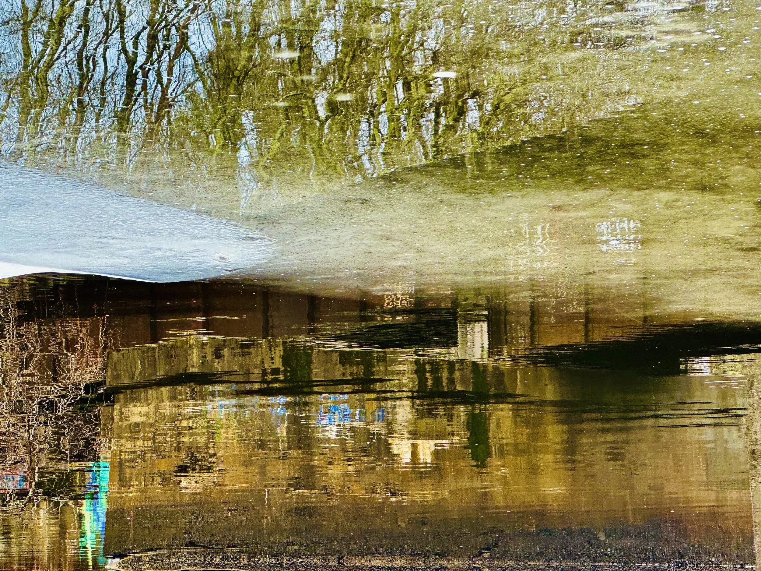 Rain all night. The field is pocked with pools of water and wet ice in process of melt. I don’t feel refreshed. The sky has no give. It’s gray and mist. I have no energy to work on poems this morning. Maybe later in the day. I go out and walk in the wet. It’s very January. Milder, less biting cold. But bleak. Frank and I drive to Concord to meet Franci and will to grab a bite and take a drive and have coffee. It’s bright with them. The sun comes out. Low scattered clouds but pretty scenery and cheerful conversation. My energy stays low all day though, and that’s okay. A recovery day. It’s good to have a rest.