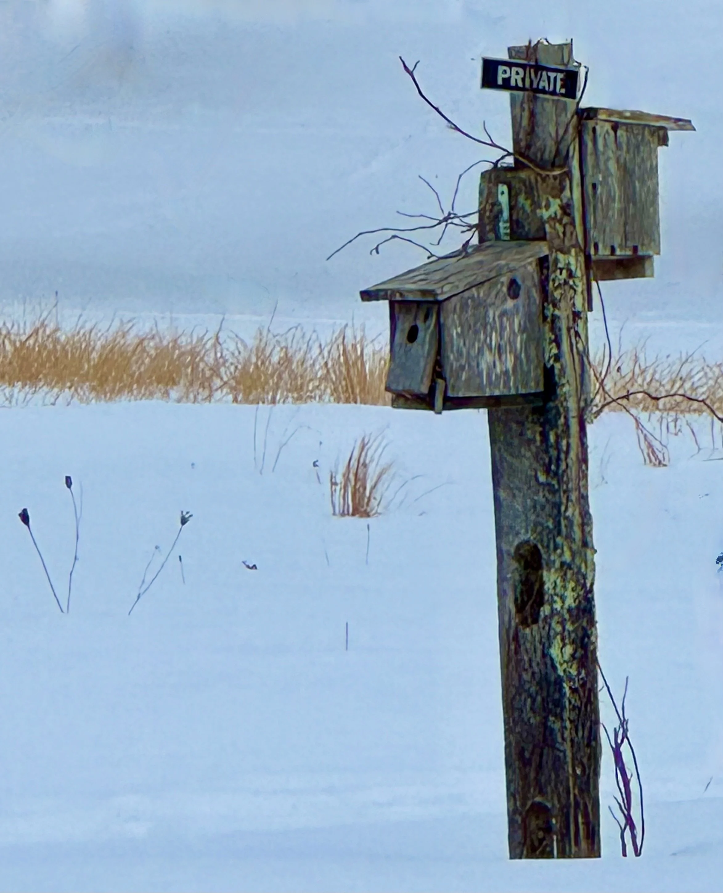 I have a valentine beside me and it’s not Frank, who has risen early. This is a valentine to pecks my sleeping hand like a little bird.It’s a boy who is happy I’m home and he is nestling in warm. I make him hot chocolate and marshmallow, two eggs and a bagel. He is happy I’m home. I go out for my ski, same trail as yesterday. The snow is faster today and it’s an easy ski. Still no sign of birds, except tracks. And people are walking their dogs. Two dogs I come across are frightened and won’t pass me. I have a client today late morning; squeezed in because I’m been away. In the late afternoon we have so much fun playing pickle: my son and daughter and her fiance. I play well, we laugh and really enjoy ourselves. I have bought a few valentine treats for dinner. Frank cooks a delicious meal and all of us are there together to enjoy it. After dinner, some talk about the wedding. Some dessert. Some valentines. Then I must go upstairs and do a bit of prep for my all-day manuscript workshop tomorrow. Leaving the club after pickle I call everyone’s attention to the light: it’s 5: 20 and still light out. Days are lengthening. In about two weeks we’ll change the clocks and get that lingering hour of daylight to enjoy. It isn’t until I am editing my bird box photo to post it here tonight that I notice the “Private” sign and I laugh. As if the nests inside the boxes are giving trespassers fair warning.