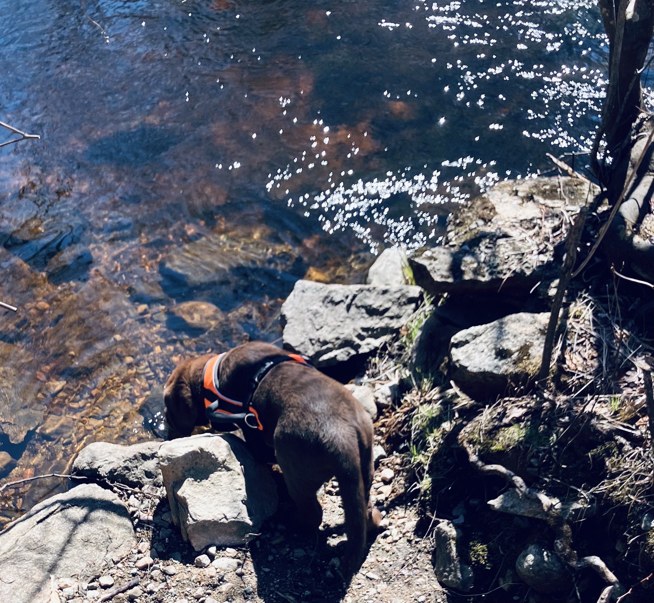 Ooops. Frank up early. Back to bed. And Chippie wouldn’t settle down, so I got up. Tried to take him out into the field for a walk but it turns out he was afraid of the dark. I managed to get him settled and I got a bit more sleep. He’s growing like crazy. Kind of day when I could get some tasks behind me and feel relief. No time to write, but I ran critique group, especially satisfying, then Israeli group, then a client. Got some time trimming brush. Frank complimented me this morning because he saw out the window the effects of my dead brush and branch clearing across the field. There’s a certain time of early morning when the sun is shining on the river and it sparkles and he could see through the pines the river sparkling in sun. I wanted him to see that moment and appreciate it. Daughter’s bridal shower coming together. Whew! I trust she will be happily surprised. Chippie likes the Trustees trail and trots along, stops at the brook, of course, where Charlie and Suzi always stopped for a drink.