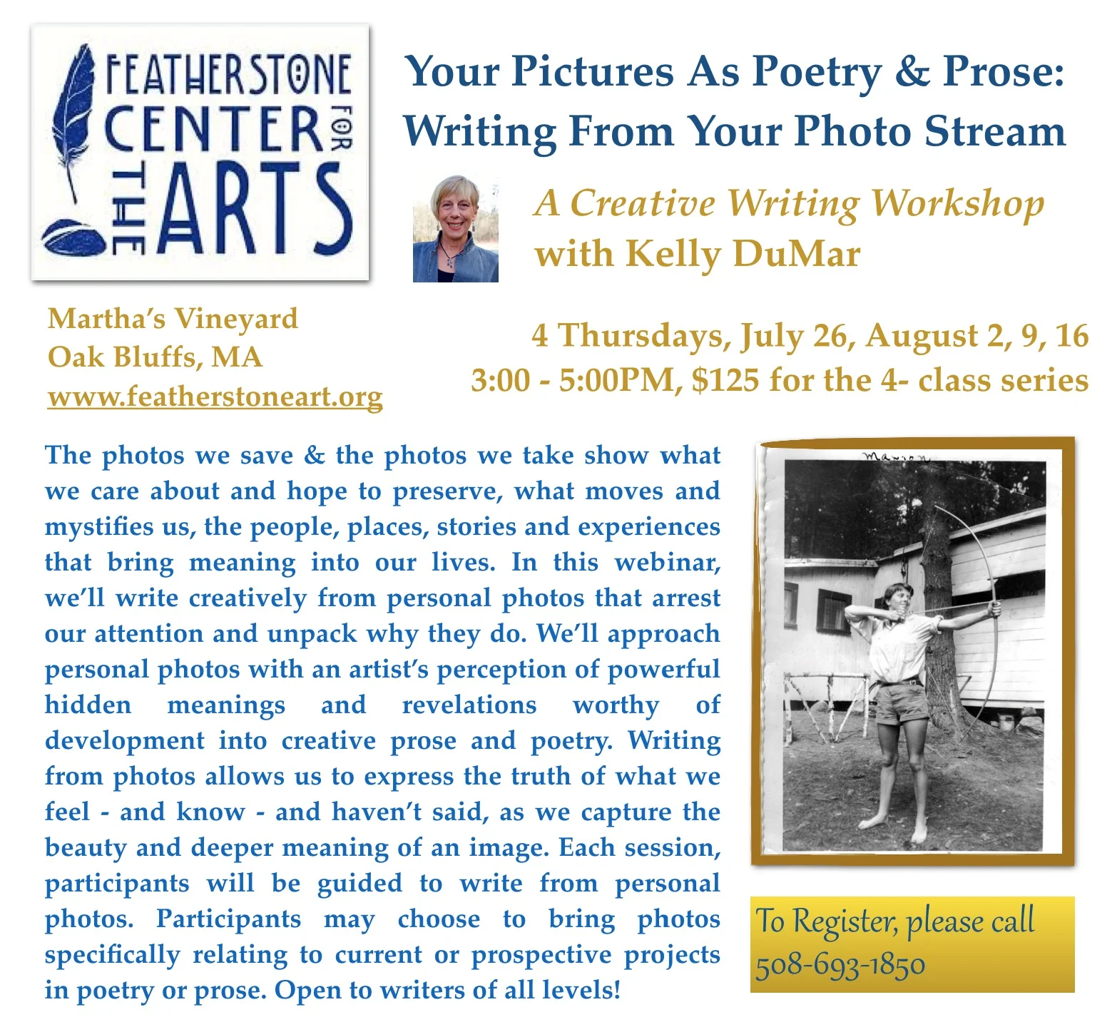 The photos we save and the photos we take show what we care about and hope to preserve, what moves and mystifies us, the people, places, stories and experiences that bring meaning into our lives. In this workshop, we’ll write creatively from personal photos that arrest our attention and unpack why they do. Writing stories from photos allows us to approach our pictures as works of art – no matter the quality of the photo, we can approach them with an artist’s perception and awareness of powerful hidden meanings and revelations worthy of development into creative prose and poetry. Writing from photos allows us to express the truth of what we feel - and know - and haven’t said, as we capture the beauty and deeper meaning of an image. Each participant will bring, weekly, 1-3 photos to explore, as we shape images into poetry and prose that reveal personalities, identity, relationships, conflicts, and universal truth and beauty. Participants may choose to bring photos specifically relating to current or prospective projects in poetry or prose. Cost is $125 for the 4-week series: Thursdays from 3-5 p.m. - July 26, Aug. 2, 9, 16