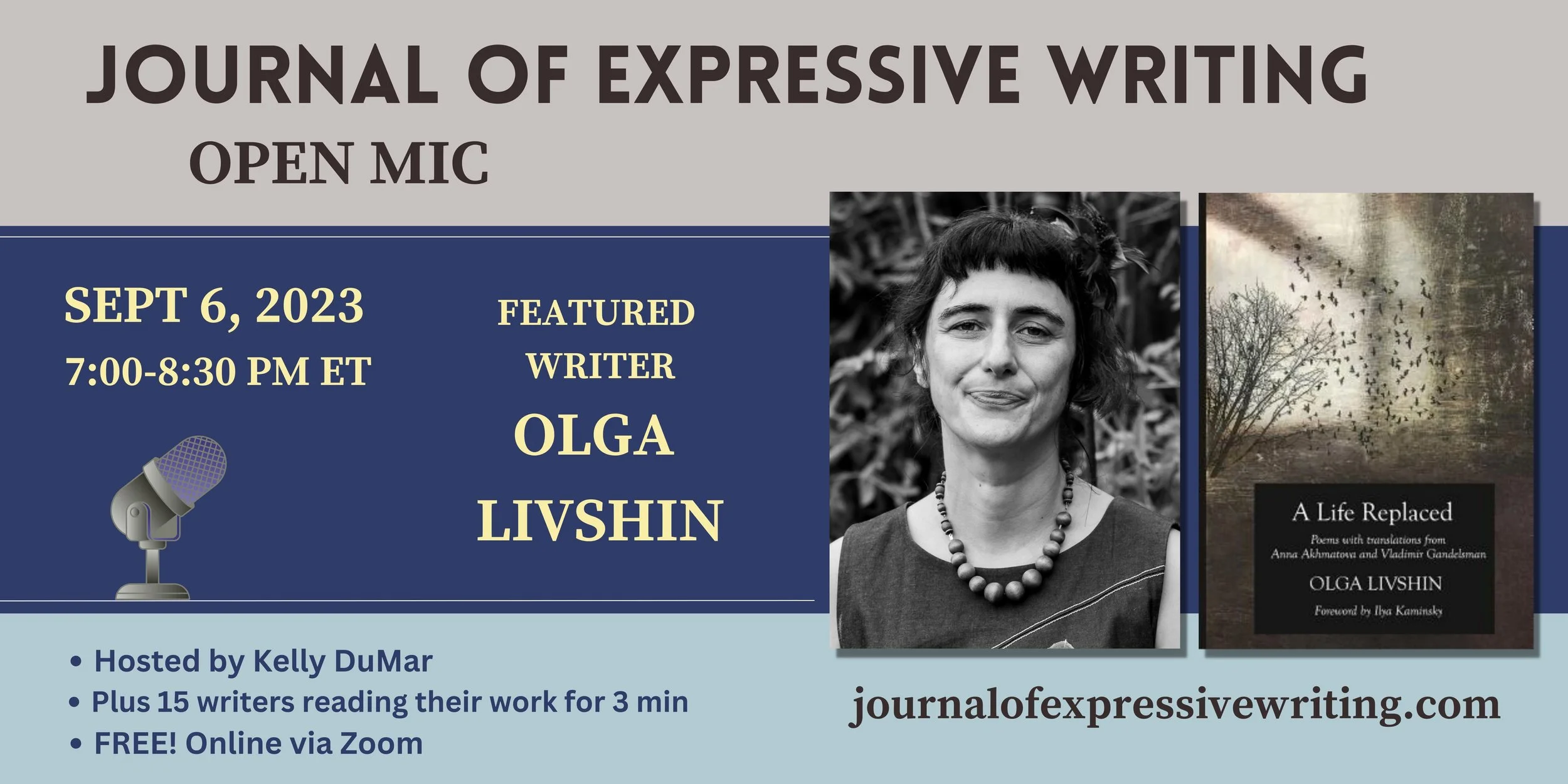 On Wednesday, Septemeber 6, 2023, I’m hosting the Journal of Expressive Writing monthly OPEN MIC series featuring poet Olga Livshin from 7-8:30 p.m. ET